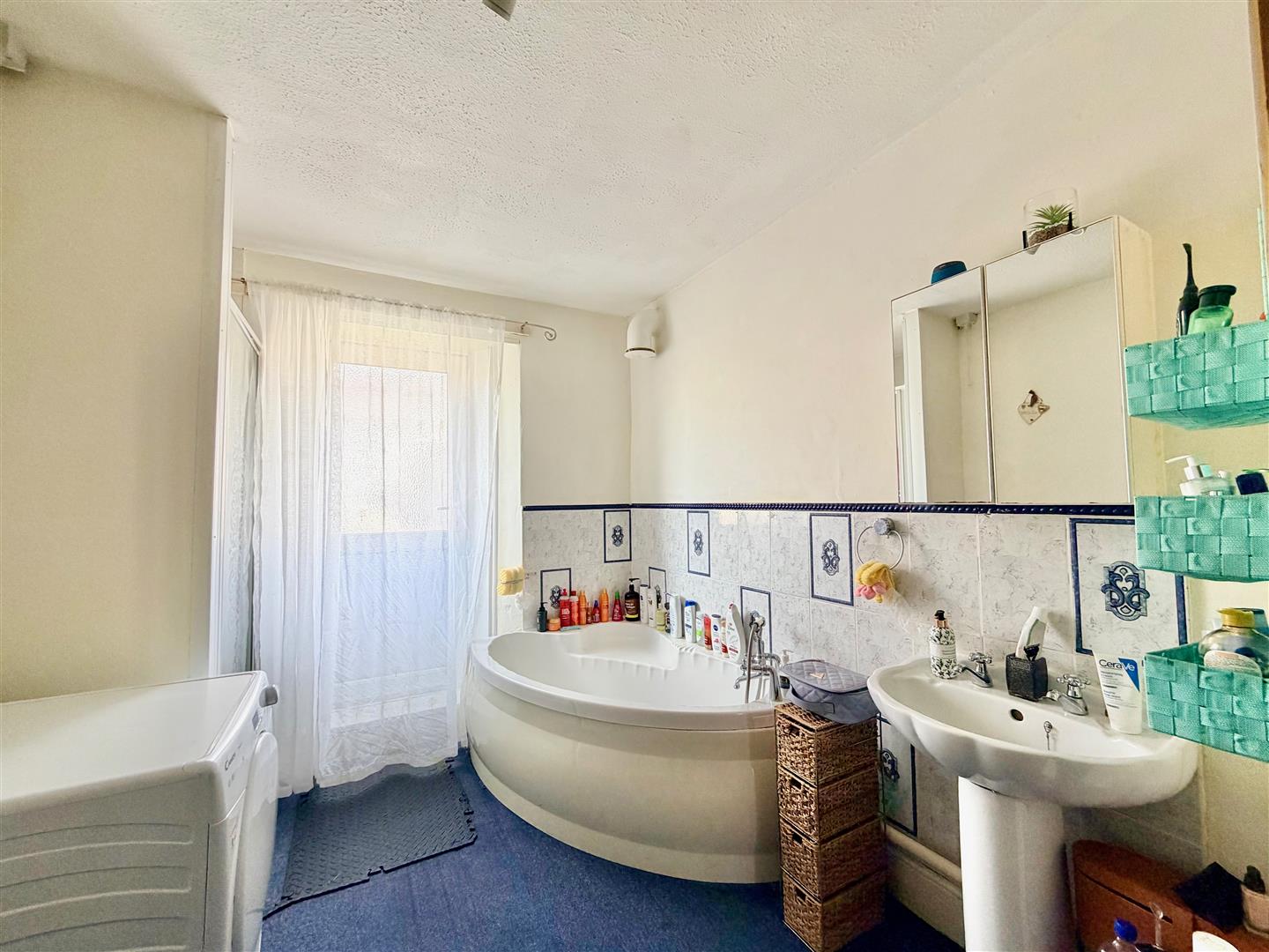 Comprising a bath with a mixer tap shower, pedestal basin and separate shower. Cupboard housing the gas boiler. Partly-glazed door to the rear opening onto a decked terraced with steps leading down to the courtyard.