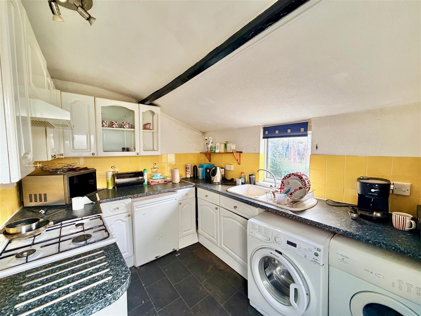 Base and wall-mounted cabinets with matching fascias, work surfaces and tiled splash-backs. Single drainer sink unit. Space for appliances. Window to the rear elevation overlooking the courtyard-style garden. Window to the side elevation. Partly-glazed door leading to outside.