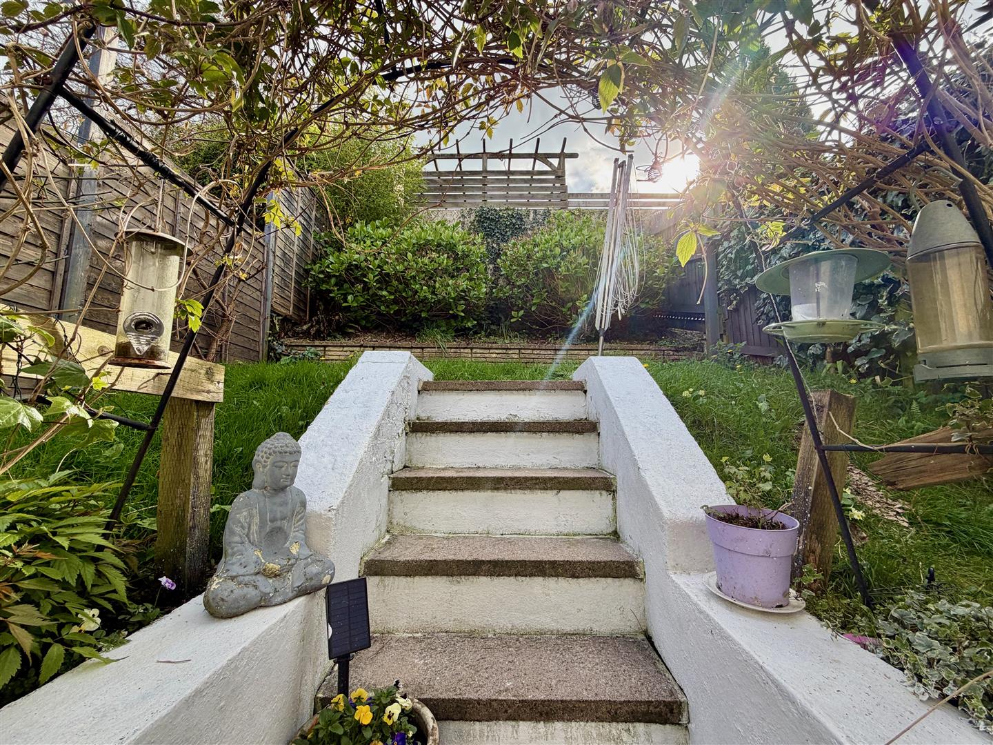 The property is approached by steps leading to the front door, with a small area of lawn. A path leads around the side of the property to a wooden gate which provides access to the rear garden, which is enclosed and southerly-facing. Immediately adjacent to the rear of the property there is a patio area with steps ascending to a lawned garden and a raised rockery with mature planting.
