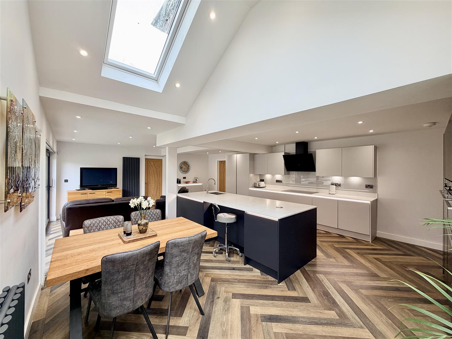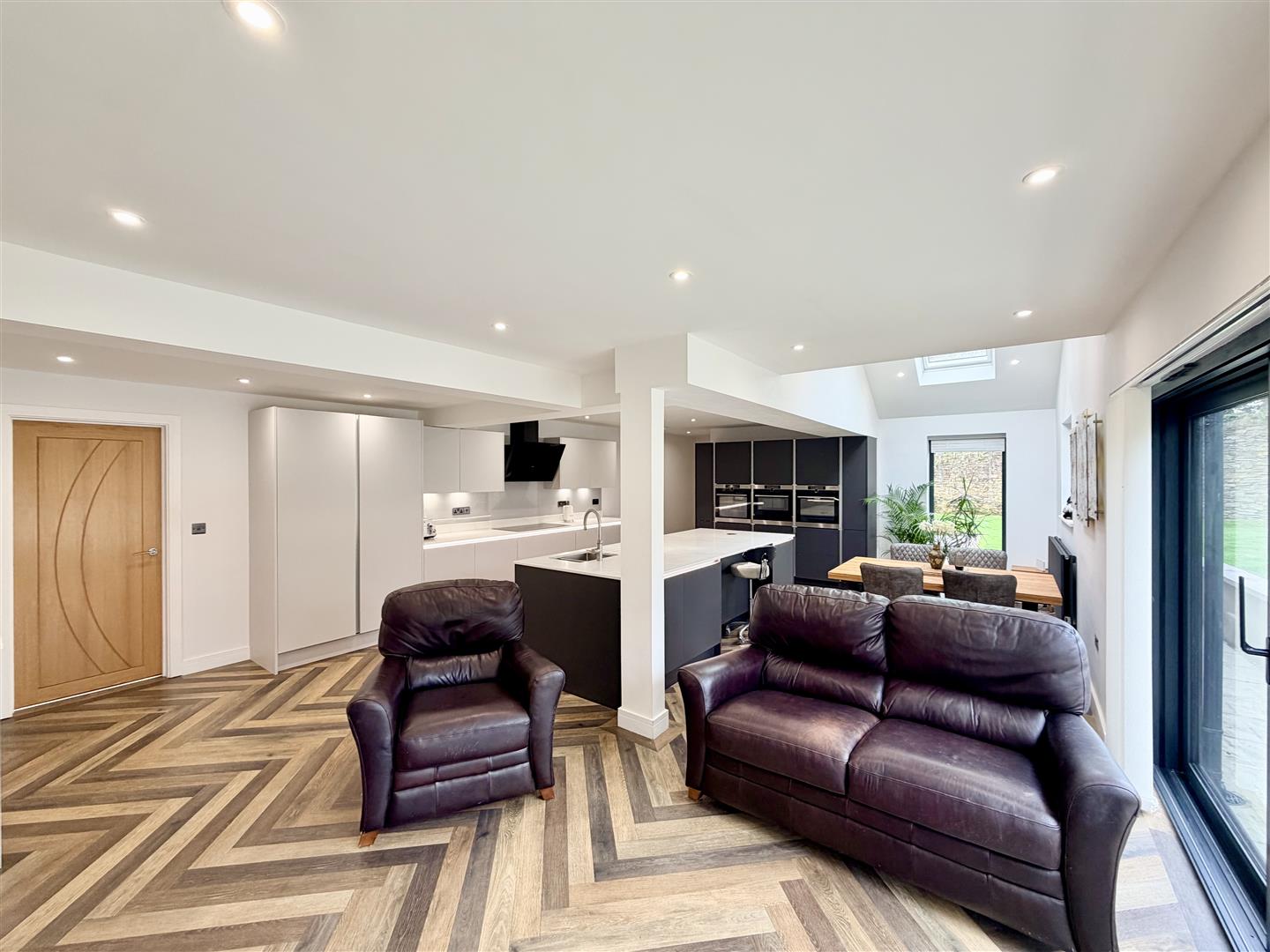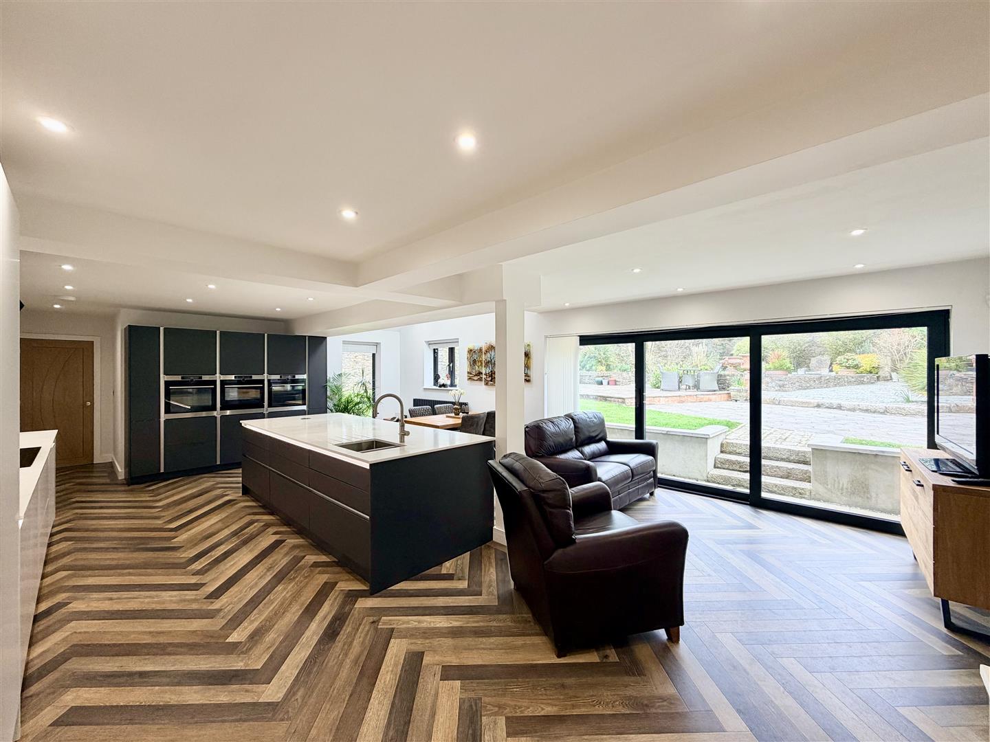 Superb spacious room. Two velux double-glazed roof lights. Triple sliding doors opening to the rear garden. Quality fitted integrated kitchen. Large central island incorporating 1.5 bowl under-mounted sink with Quooker tap & waste bins. Quality appliances include 3 ovens, 2 with steam facility & 1 with combination microwave. Integrated AEG fridge & separate freezer. Integrated dishwasher. AEG variable sized hob with extractor hood over.