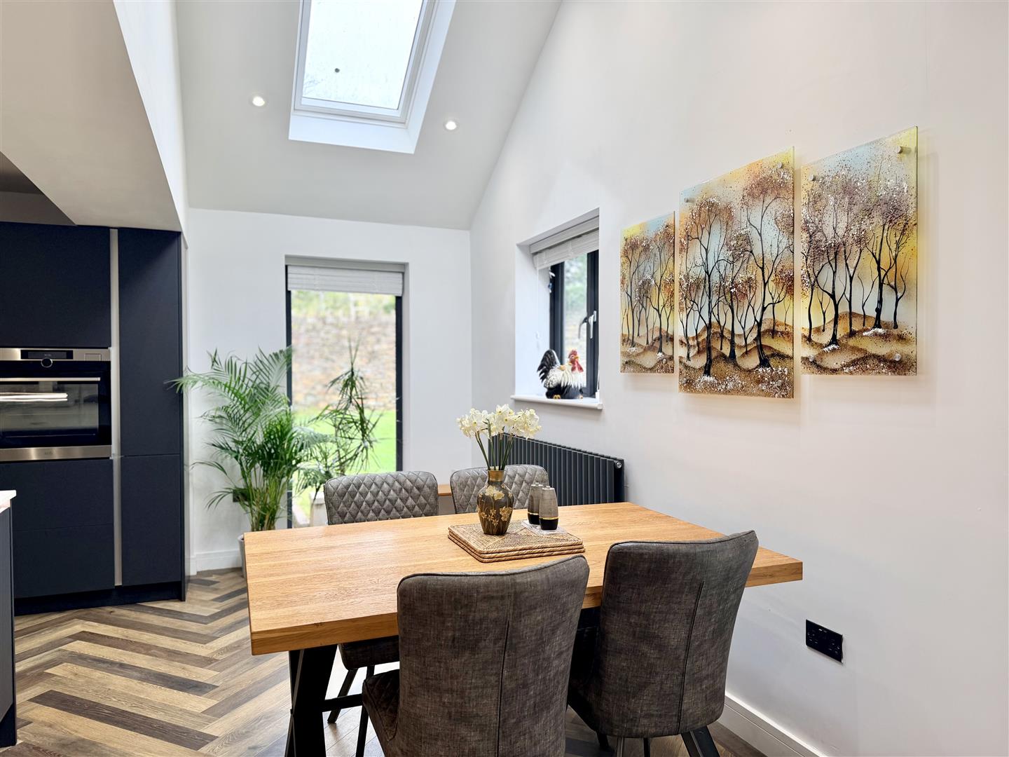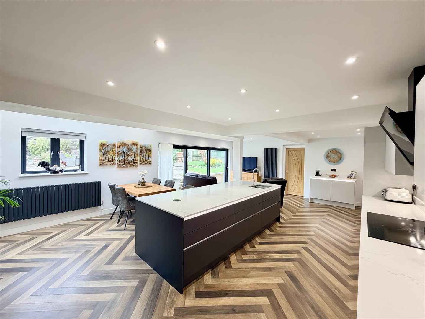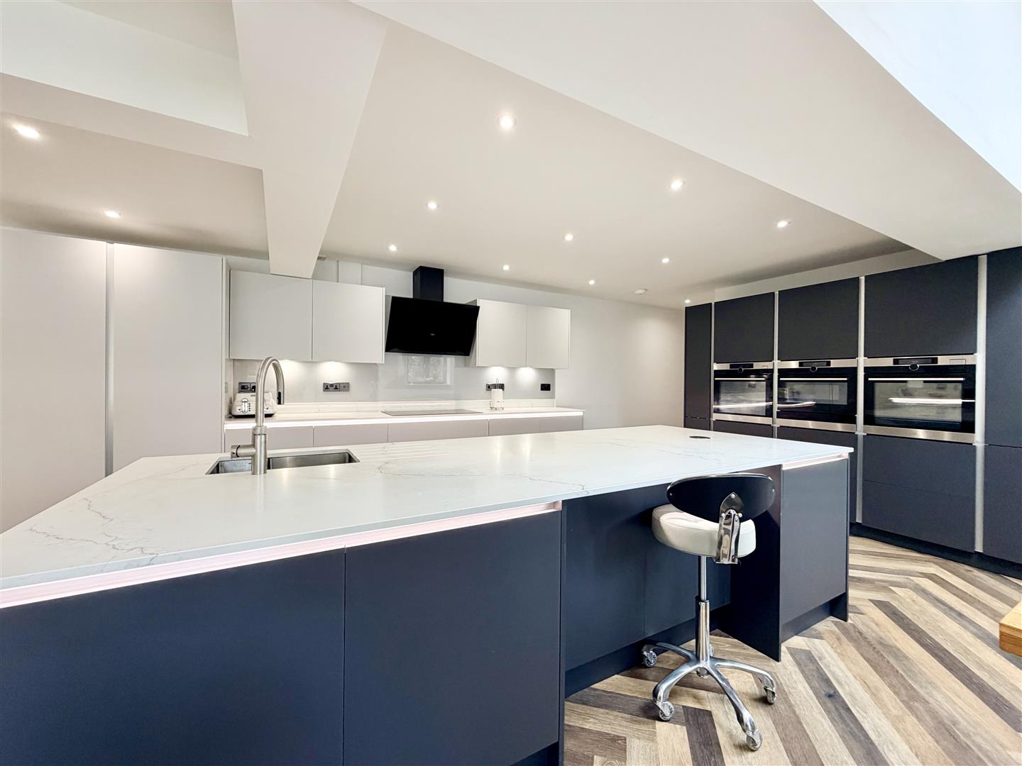 Superb spacious room. Two velux double-glazed roof lights. Triple sliding doors opening to the rear garden. Quality fitted integrated kitchen. Large central island incorporating 1.5 bowl under-mounted sink with Quooker tap & waste bins. Quality appliances include 3 ovens, 2 with steam facility & 1 with combination microwave. Integrated AEG fridge & separate freezer. Integrated dishwasher. AEG variable sized hob with extractor hood over.