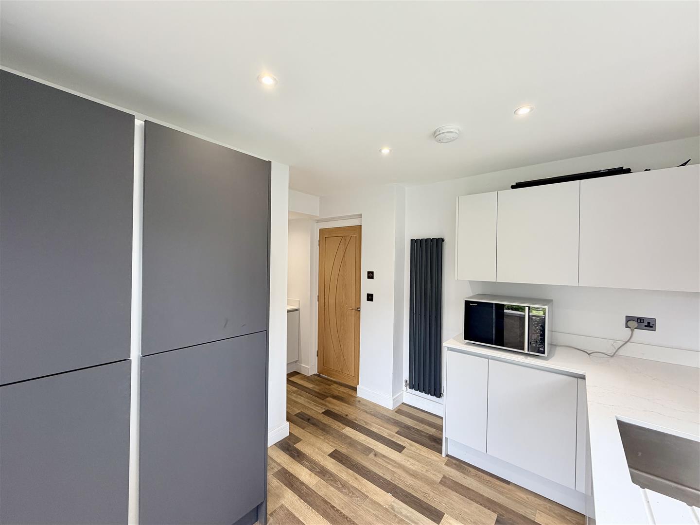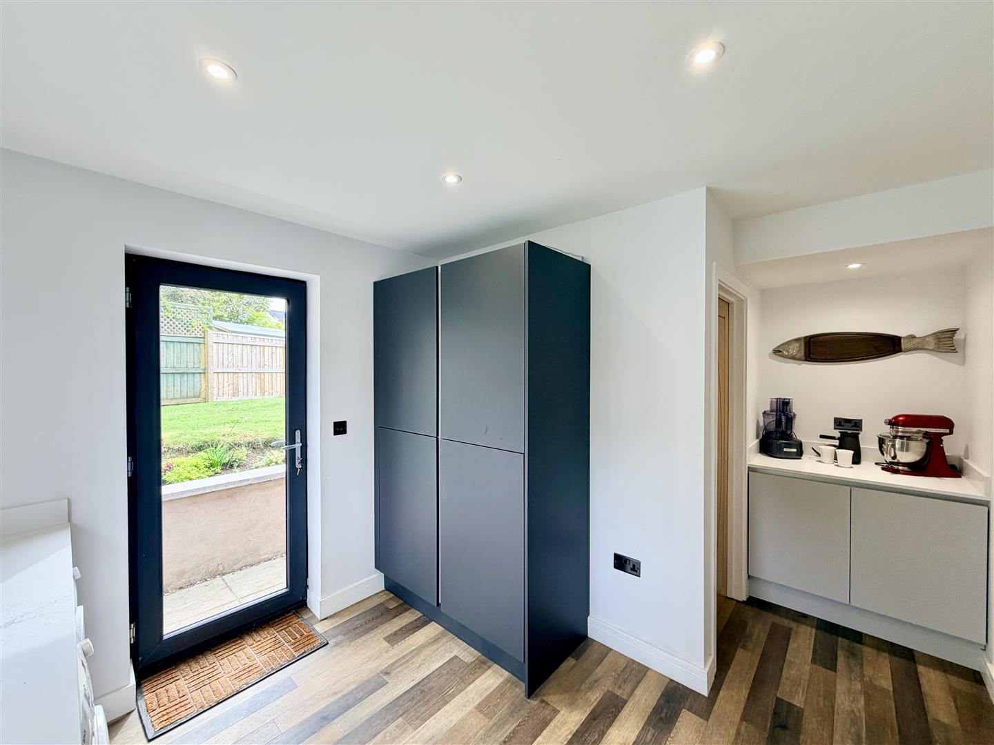 Window overlooking the rear garden & door to the side. Kitchen with Caple under-mounted sink. Upright fridge/freezer.