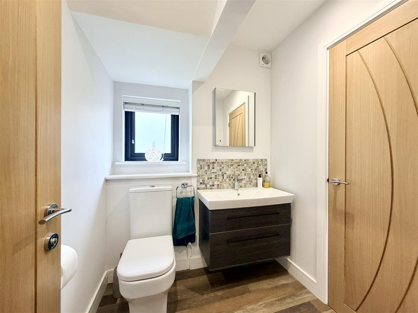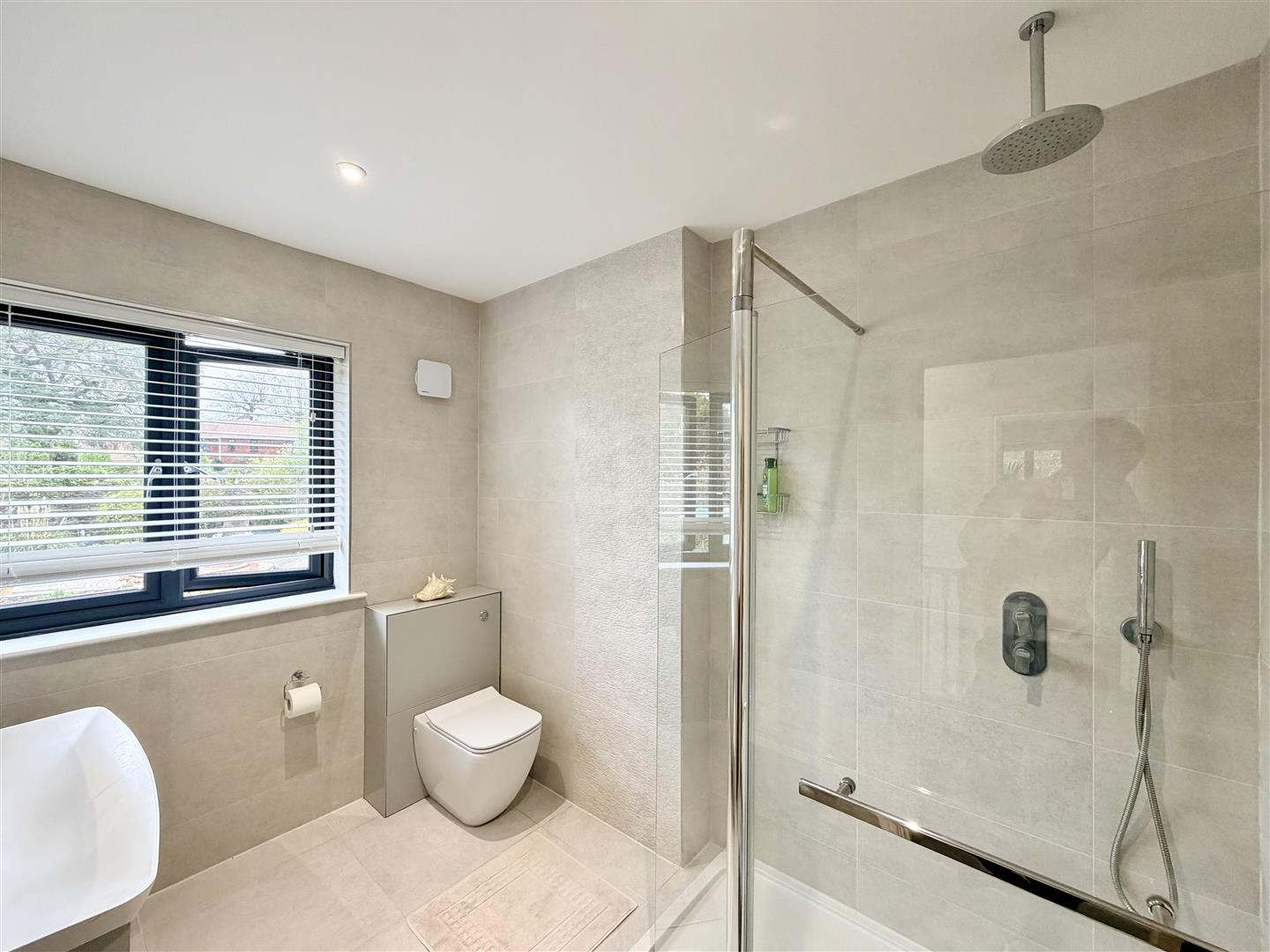 Window to the rear. Quality suite with shower having handheld mixer & overhead douche spray, Utopia wall hung wash hand basin & close coupled wc.