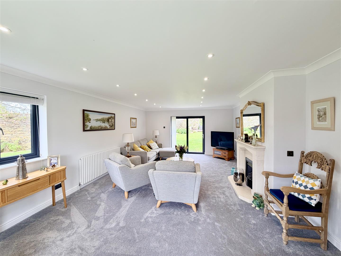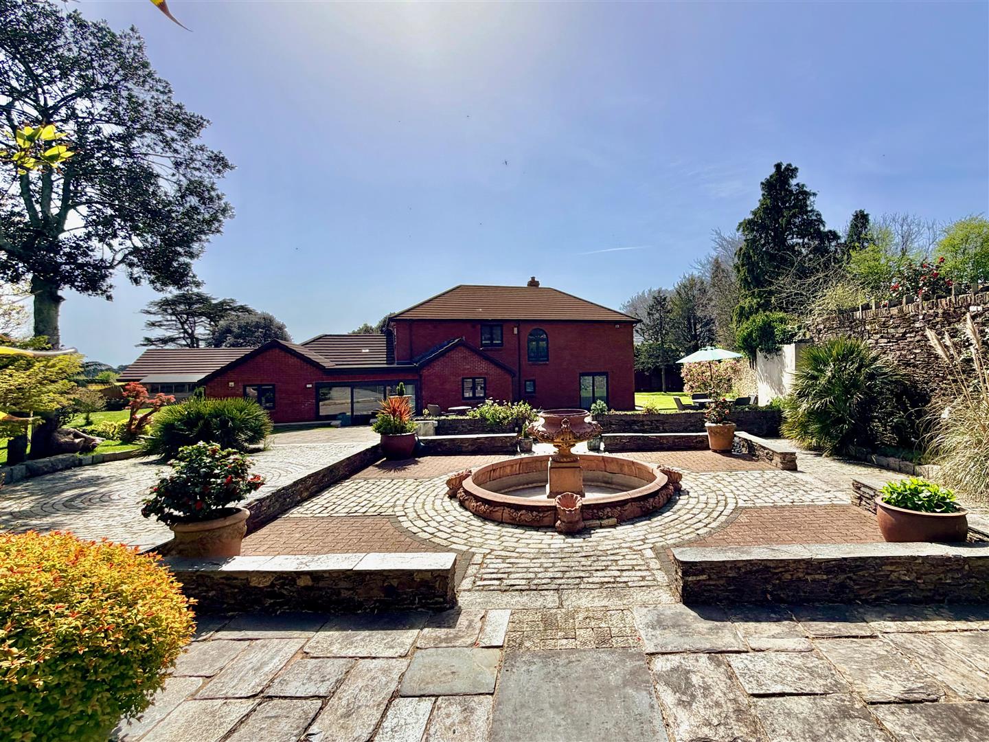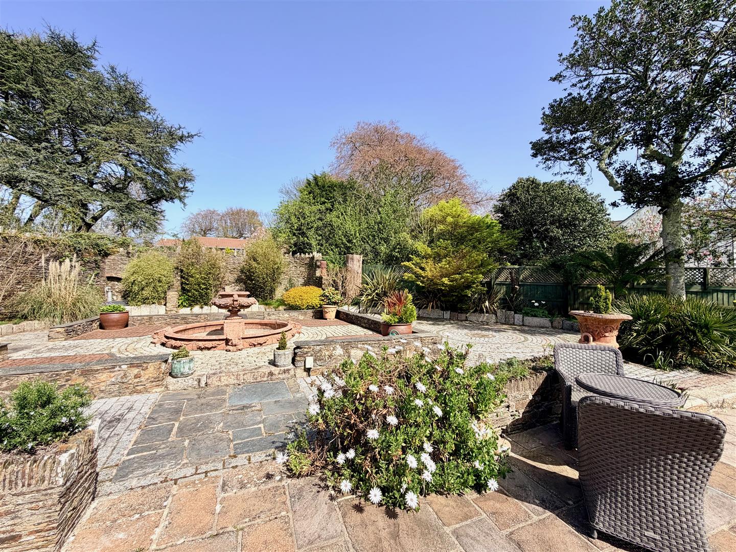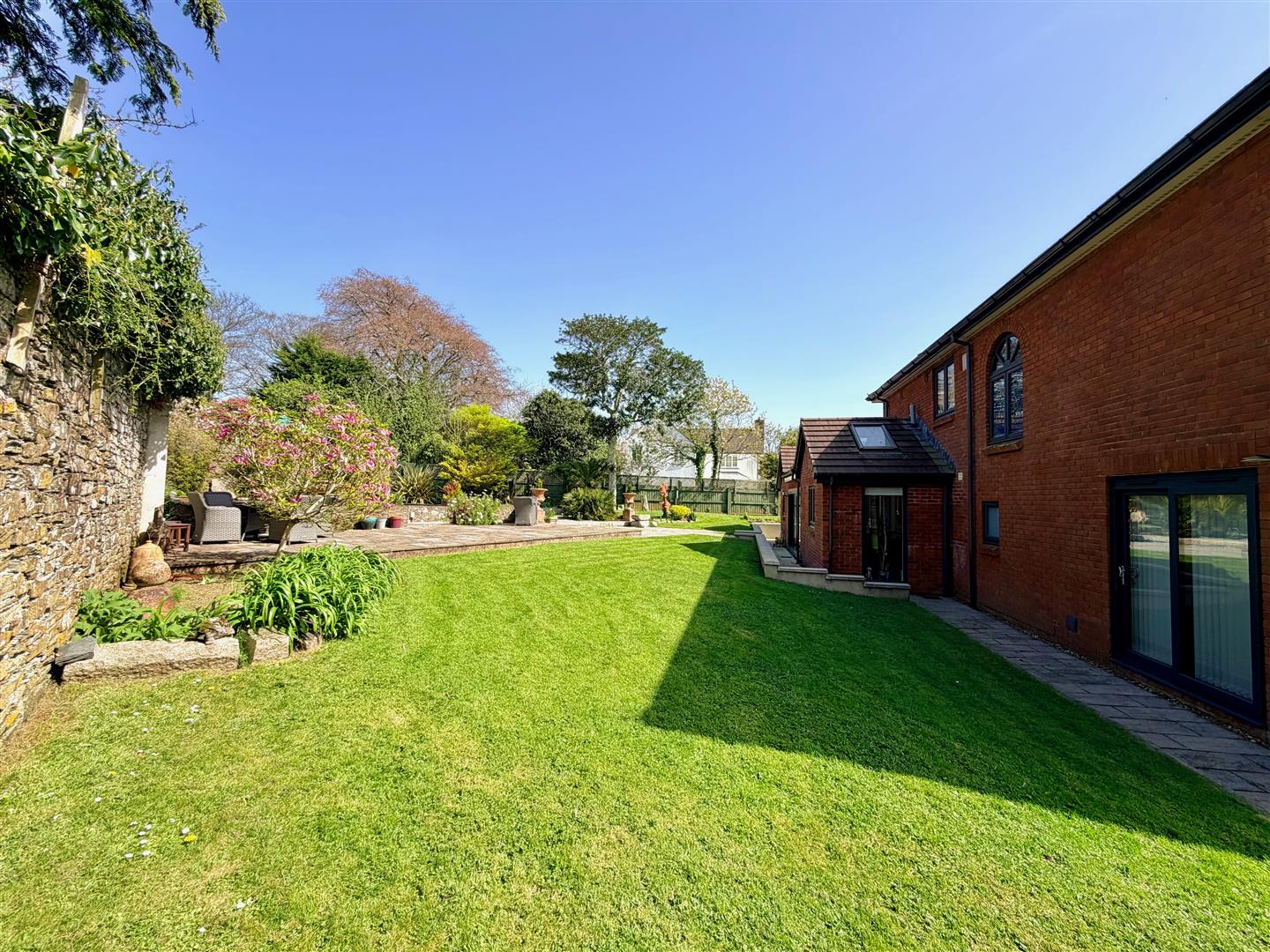 Externally, the property boasts beautifully maintained, near-level walled gardens, offering a high degree of privacy. Extensive patio areas create the perfect setting for outdoor dining and alfresco entertaining.