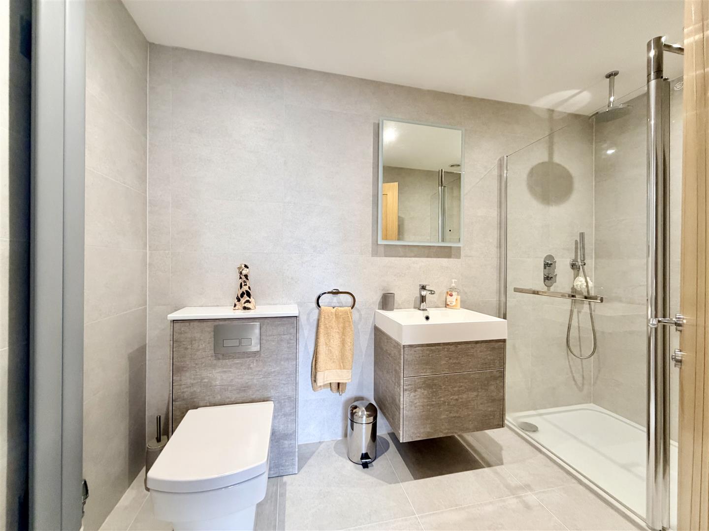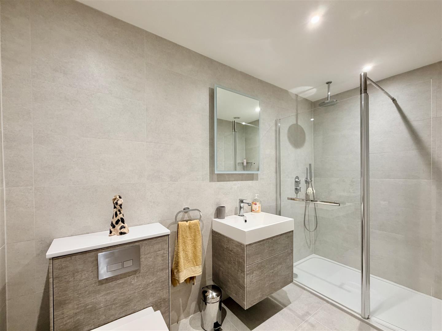 Wash hand basin, wc & walk-in shower.