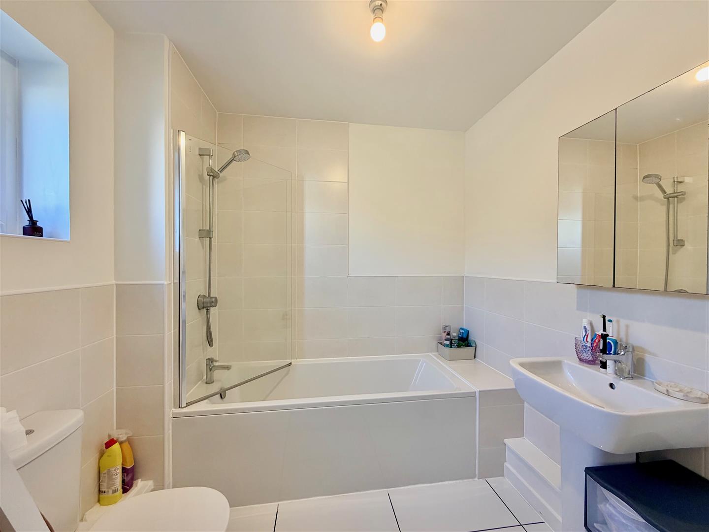 Comprising a bath with a shower system over and a glass shower screen, pedestal basin and wc. Mirrored bathroom cabinet. Tiled floor. Partly-tiled walls. Obscured window.