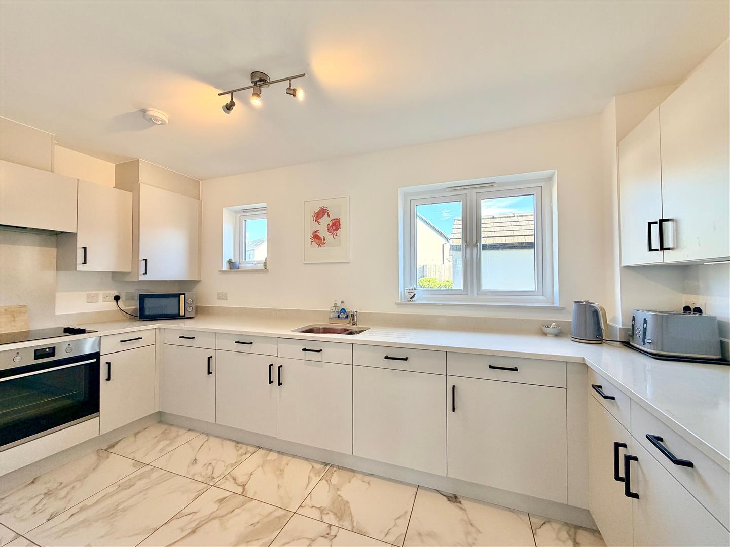 Range of base and wall-mounted cabinets with matching fascias, work surfaces and splash-backs. Inset stainless-steel one-&-a-half bowl sink unit with a work-top mounted mixer tap. Built-in oven and hob with a matching splash-back. Integral fridge-freezer, dishwasher and washer-dryer. 2 windows.