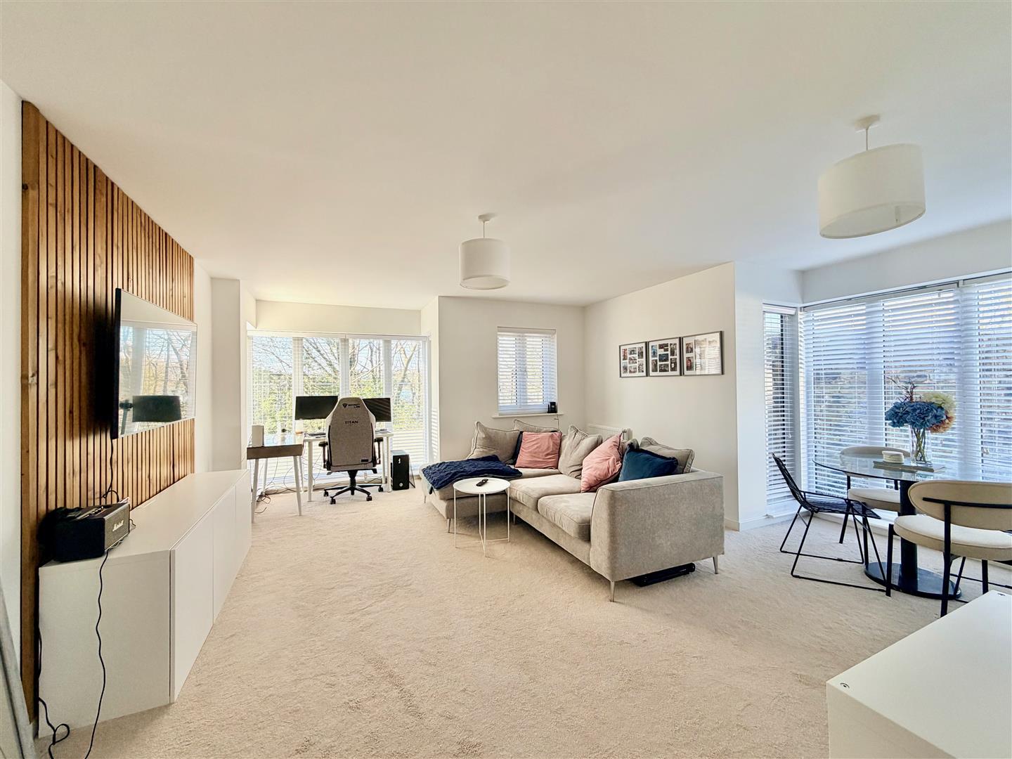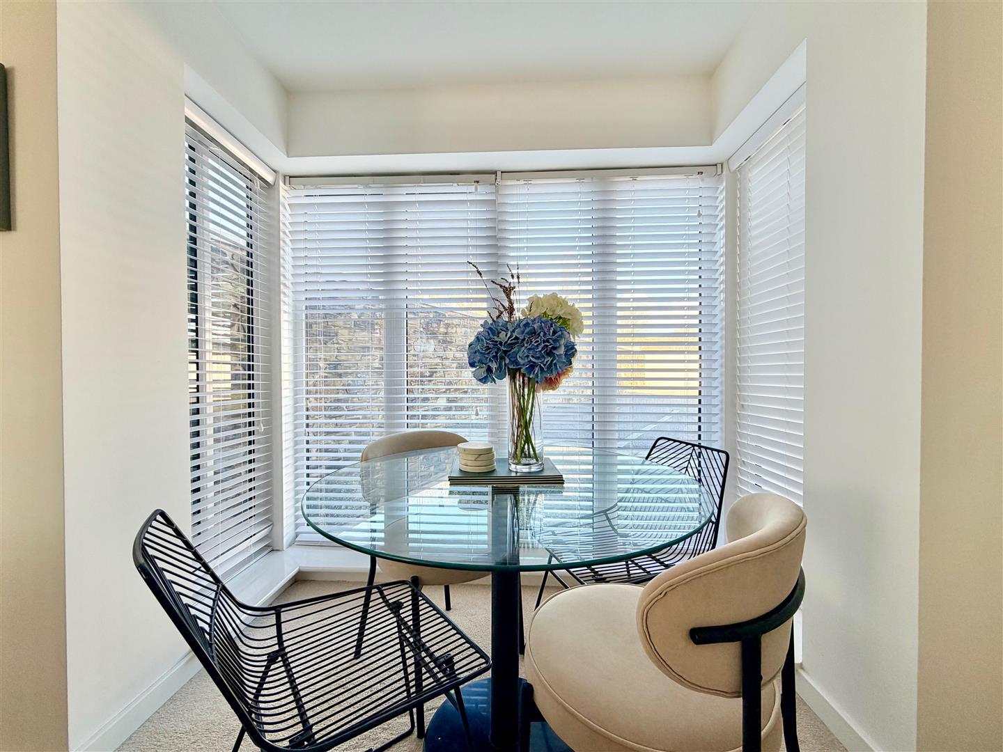 A superb open-plan room which is dual aspect with 2 walk-in bay windows plus an additional windows. All of the windows have fitted blinds. Ample space for seating and dining. Doorway opening into the kitchen.
