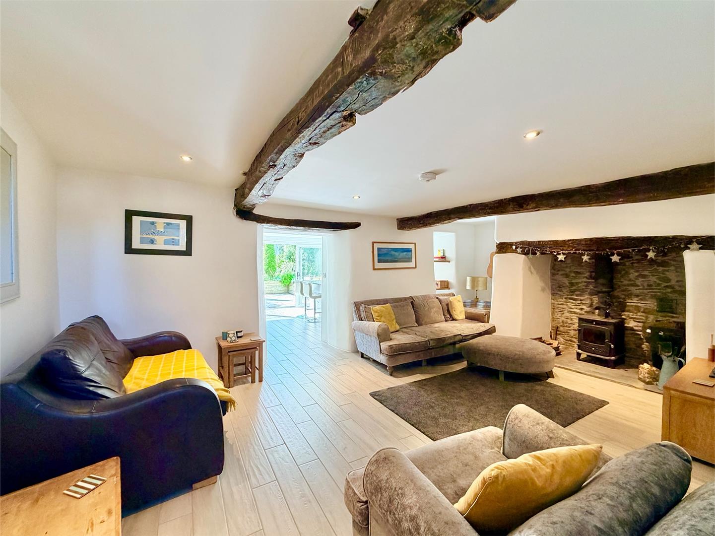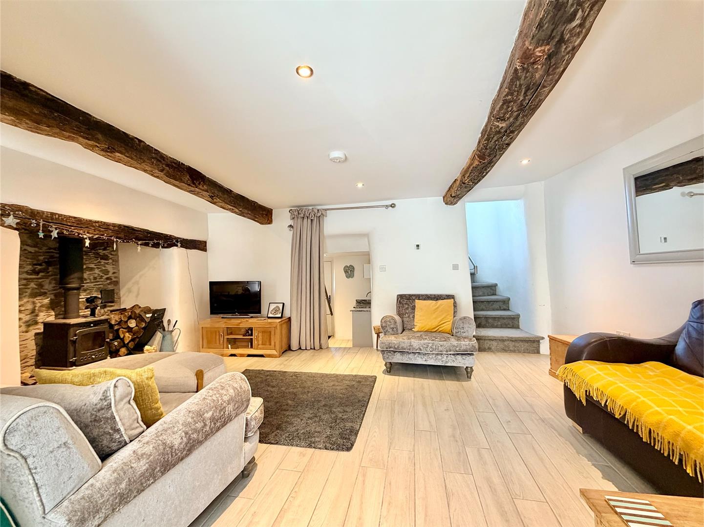 Running the full-width of the property. Fireplace with wood burner. Tiled floor. Feature beamed ceiling. Stairs rising to the first floor.