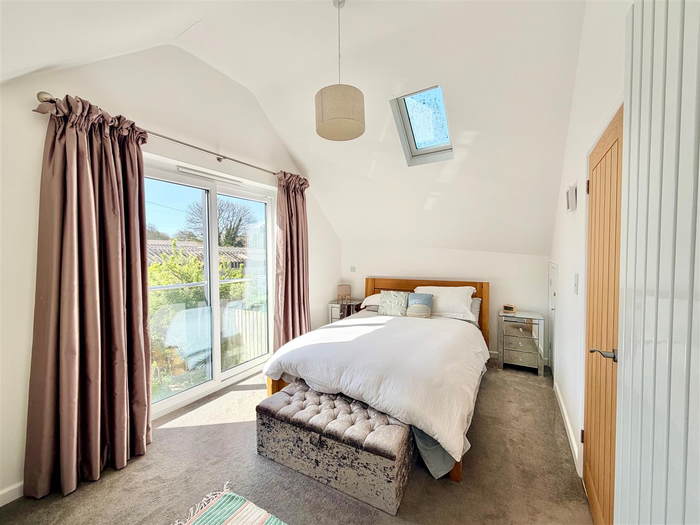Situated to rear of the property. Storage cupboard. Vaulted ceiling. Velux-style window. Sliding double-glazed doors opening to a glass and stainless-steel Juliette-style balcony. From this window there are fabulous views towards the surrounding countryside. Doorway opening into the ensuite shower room.