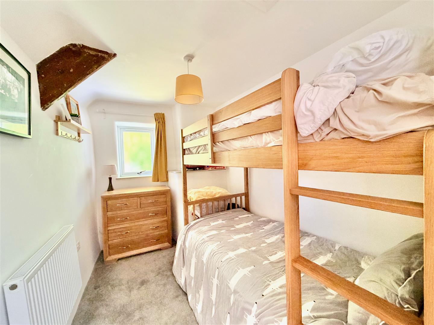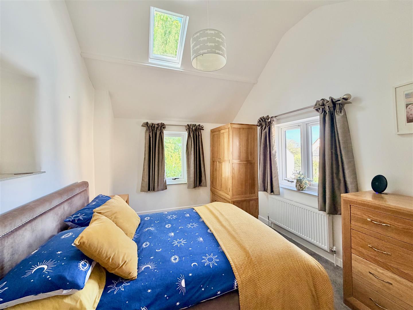 A dual aspect room with windows to the front and side elevations. Additional Velux skylight. Feature vaulted ceiling.
