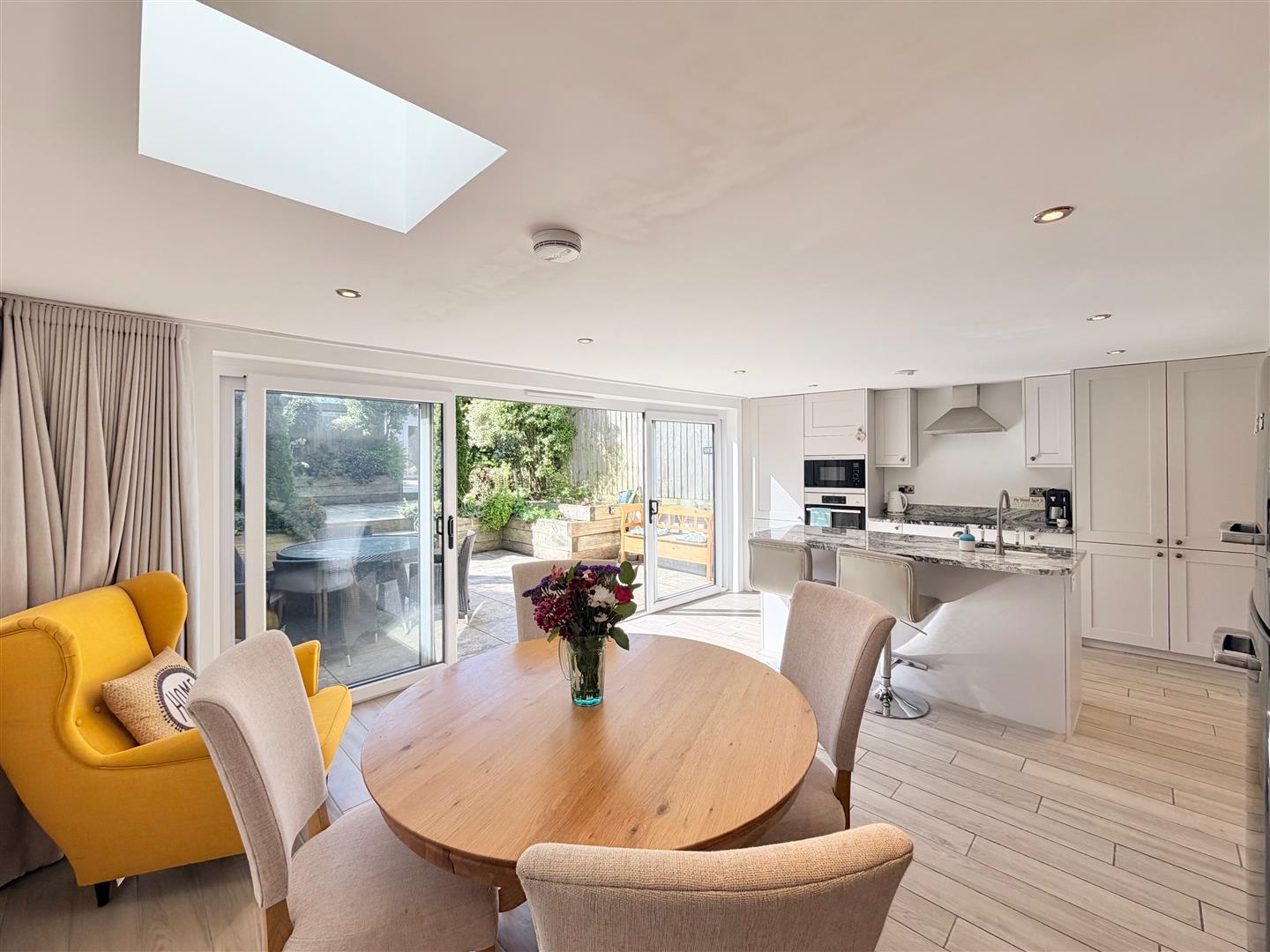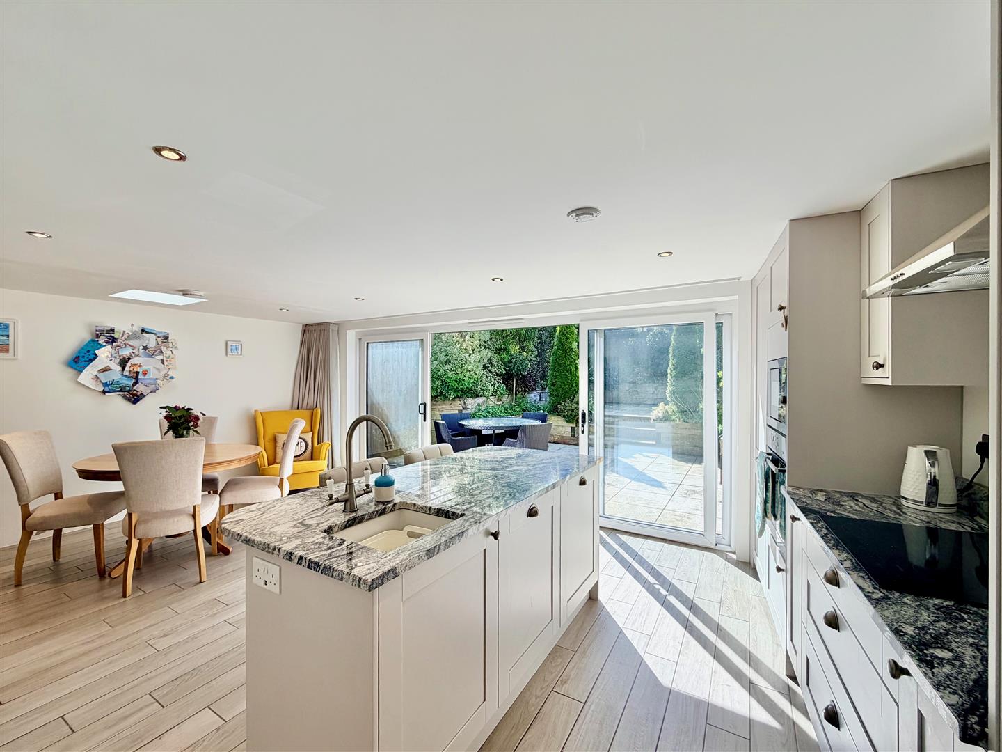 Ample space for dining table and chairs. Range of kitchen cabinets with a matching island. Polished granite work surfaces. Inset sink with a work-top mounted mixer tap. Induction hob with a cooker hood above. Built-in oven and microwave. Integral fridge-freezer. Built-in dishwasher. Breakfast bar. Tiled floor. Inset ceiling spotlights. Skylight. Sliding double-glazed doors to the rear overlooking the garden and leading to outside.