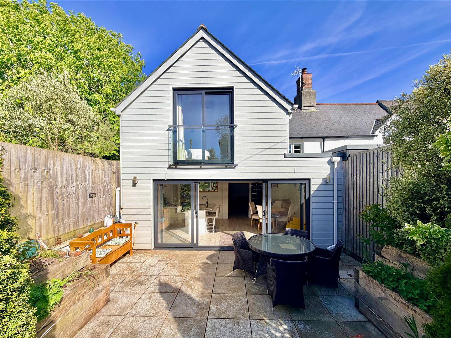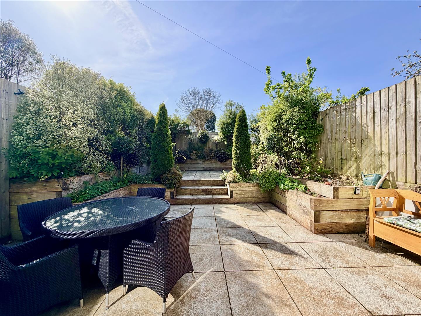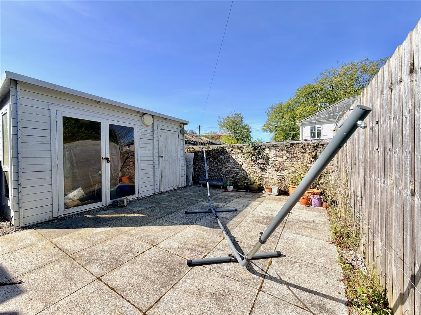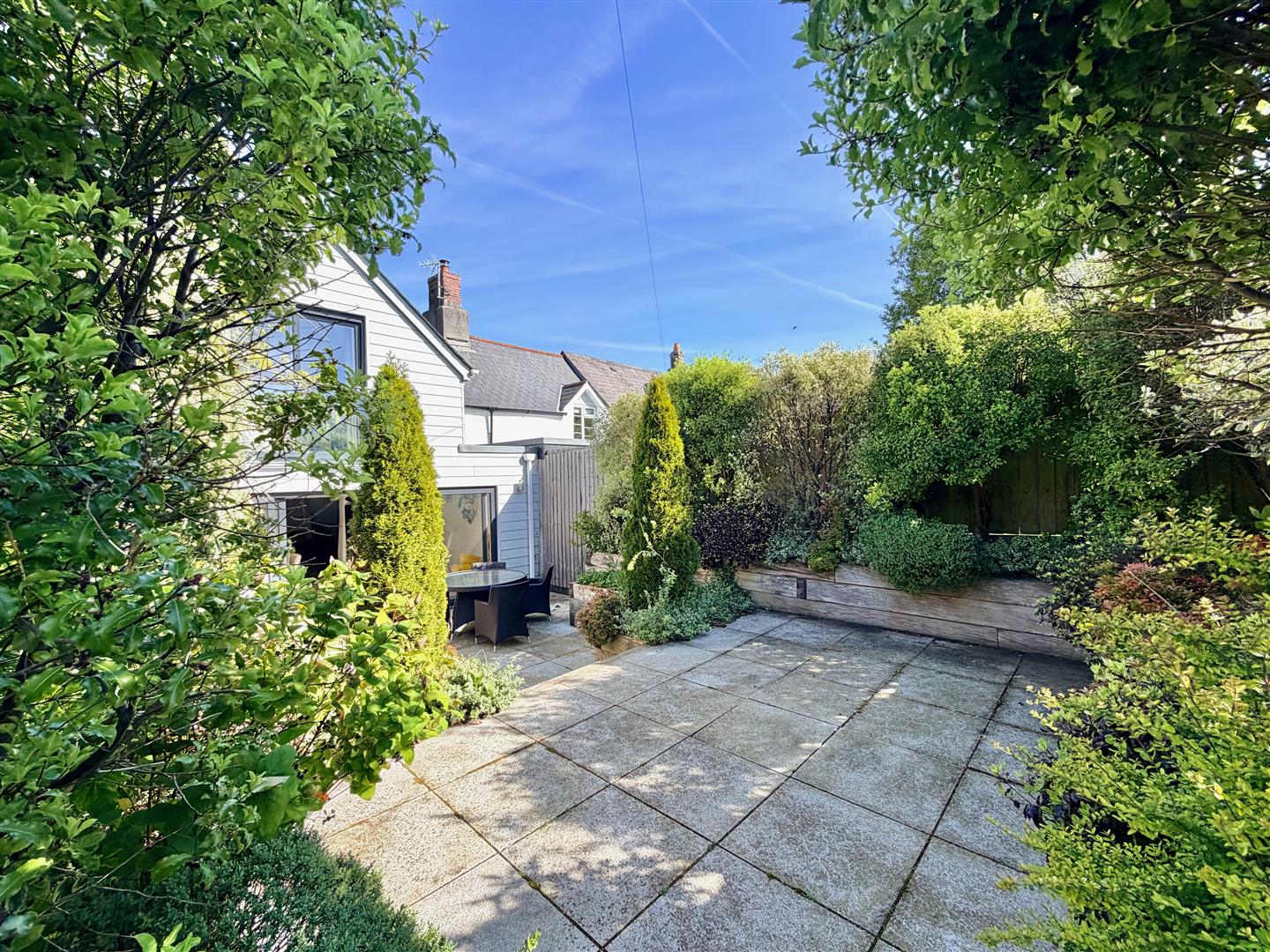 To the front is a small cobbled area. Externally-mounted gas and electric meters. A covered canopy protects the main front door. The rear garden enjoys a southerly aspect and has been landscaped. The garden is paved with bordering shrub beds nicely planted with mature shrubs. There is a secondary patio area next to the storage shed, plus an area laid to chippings. A timber gate provides access from the rear to the National Trust pathway, providing lovely walks.