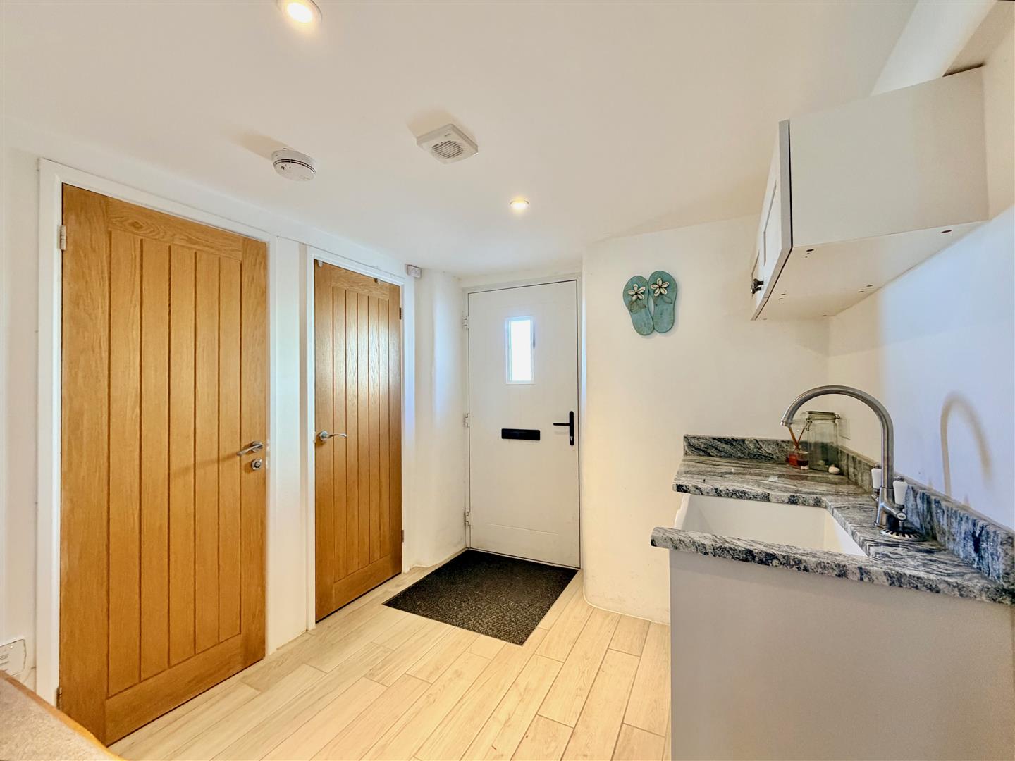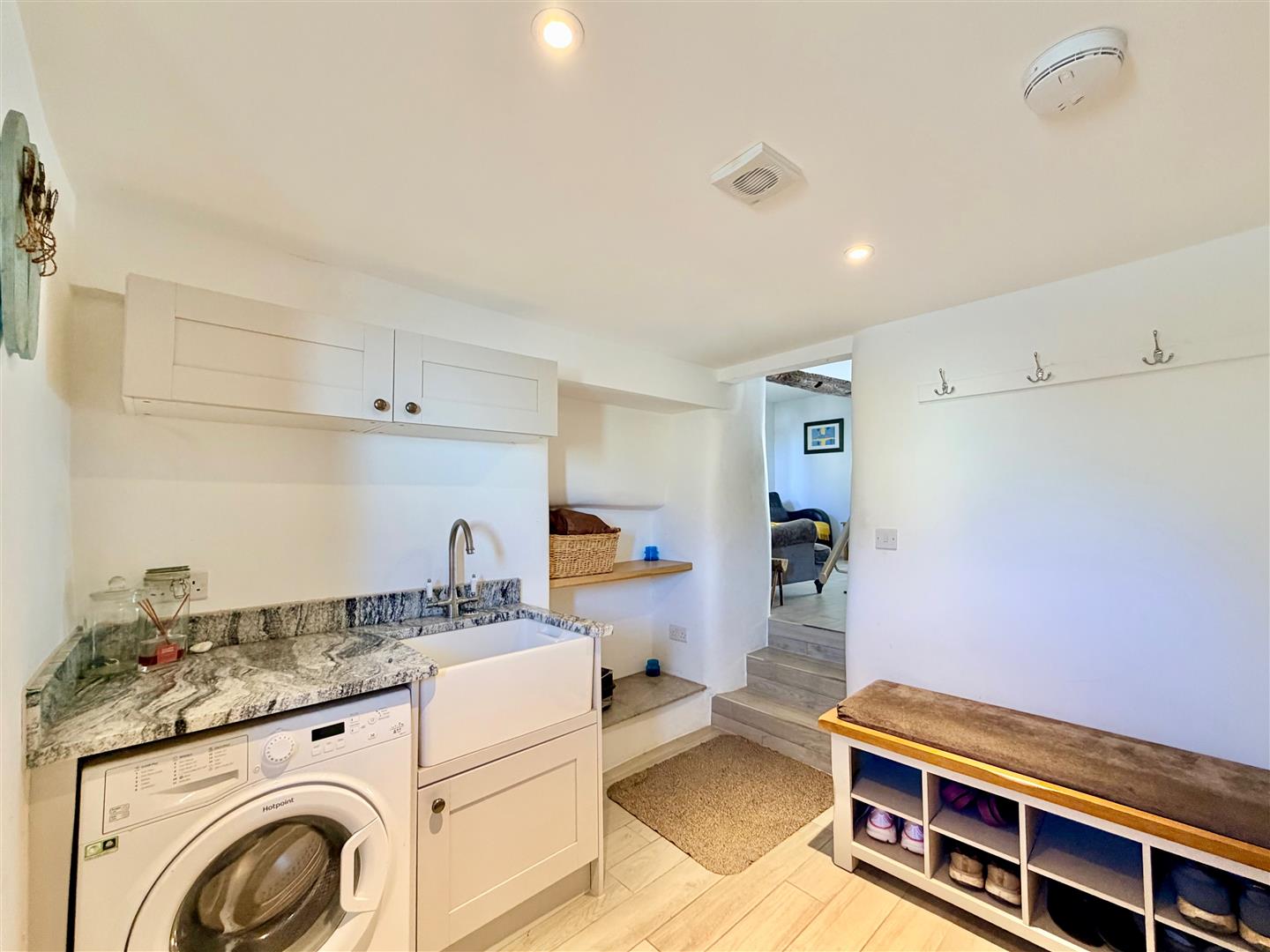 Providing access to the accommodation. Belfast-style sink with a cabinet beneath and matching wall-mounted cupboards above. Polished granite work surface. Space and plumbing for a washing machine. Alcove with shelving. Coat hooks. Storage cupboard. Tiled floor.