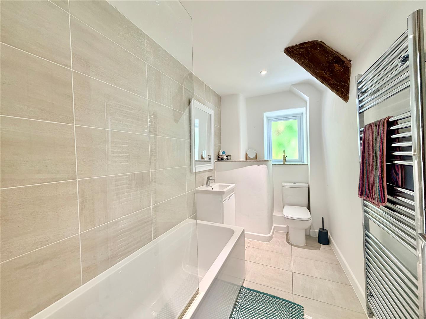 Comprising a bath with a tiled area surround, wc and basin with a tiled splash-back and a cupboard beneath. Chrome towel rail/radiator. Tiled floor. Inset ceiling spotlights. Obscured window to the side elevation.
