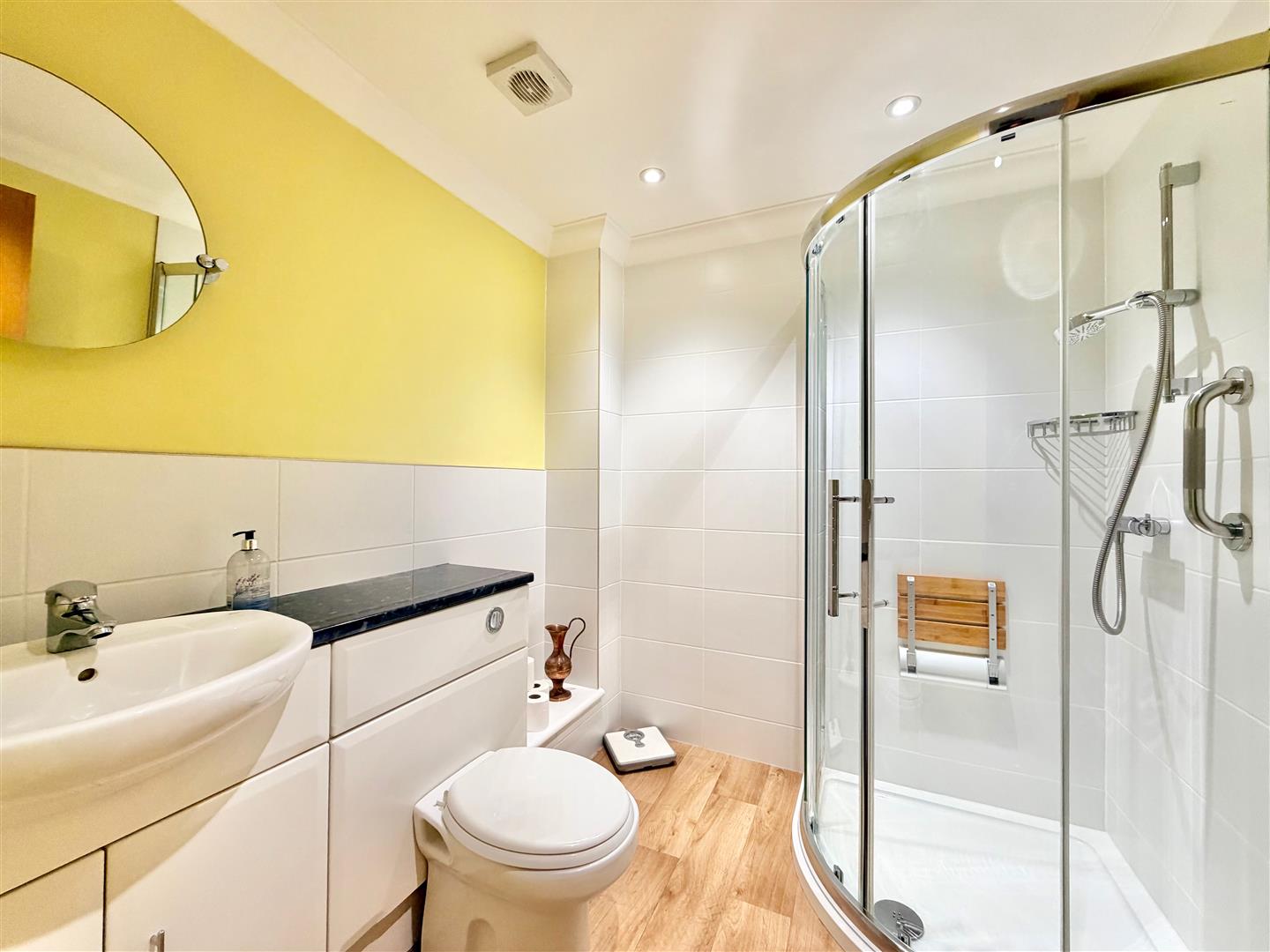 Comprising a shower, basin & wc set into a storage cabinet with concealed cistern and push-button flush. Partly-tiled walls - fully tiled around the shower area. Chrome towel rail/radiator. Coved ceiling. Spotlighting.