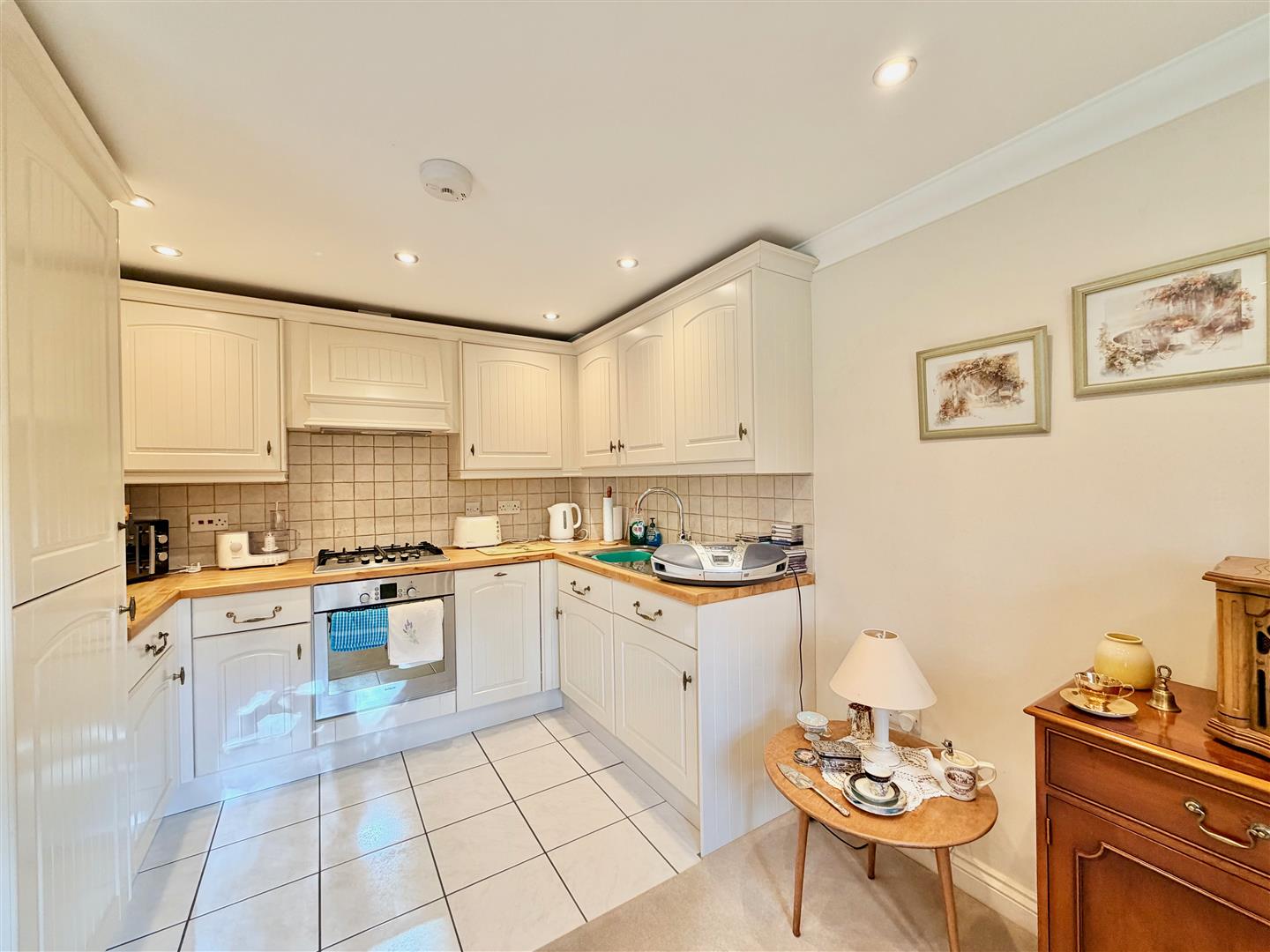 The kitchen is fitted with a range of matching base & wall-mounted cabinets with work surfaces & tiled splash-backs. Inset stainless-steel single-drainer sink unit. Integral fridge & freezer. Built-in Bosch oven & Bosch stainless-steel 4 burner gas hob with cooker hood above. Integral slimline dishwasher & washing machine. Tiled floor. Spotlighting.