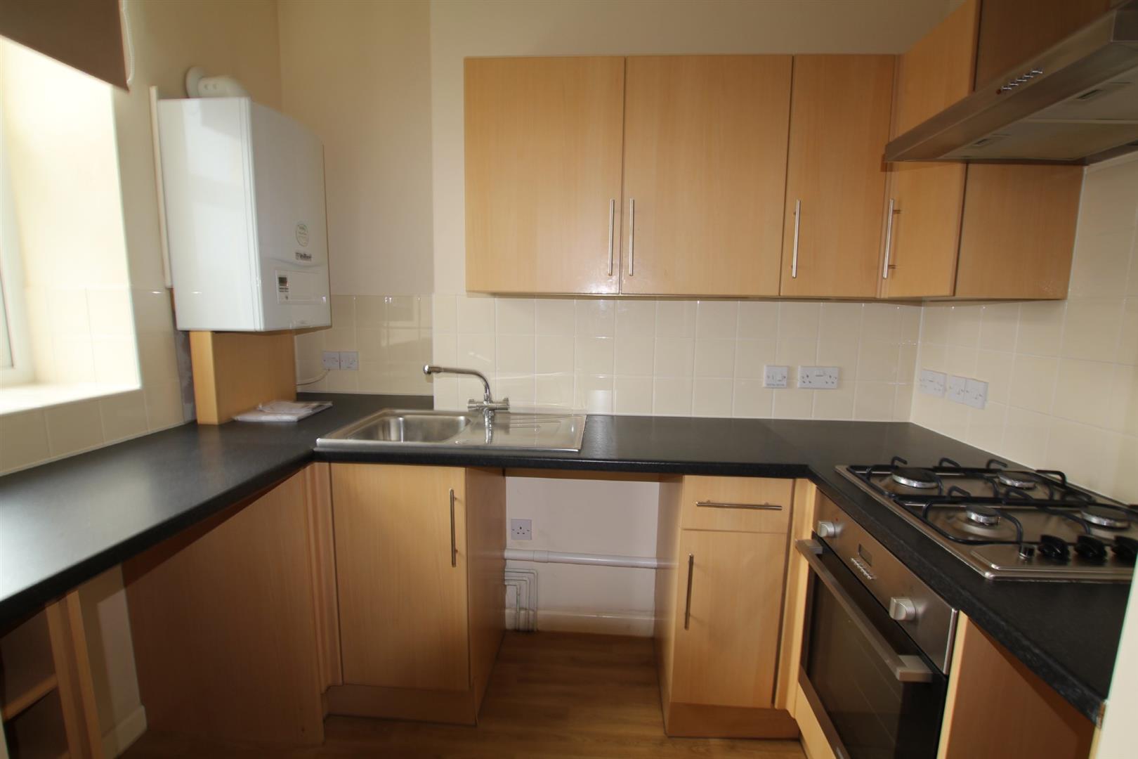 Series of matching eye-level and base units with tiled splash-backs, roll-edged work surfaces and an inset single-drainer sink unit with mixer tap. Wall-mounted gas boiler. Built-in 4-ring gas hob with electric oven beneath. Space and plumbing for washing machine. Space for under-counter refrigerator. Double-glazed window to the rear.