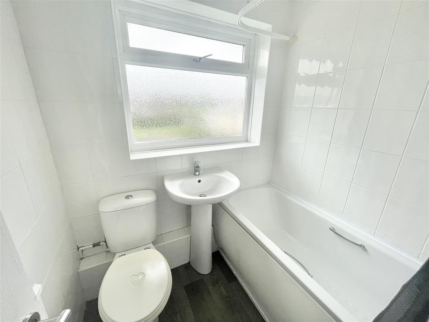 White modern suite comprising panel bath with shower unit and spray attachment over, pedestal wash handbasin and low-level toilet. Fully-tiled walls. Obscured double-glazed window to the rear.
