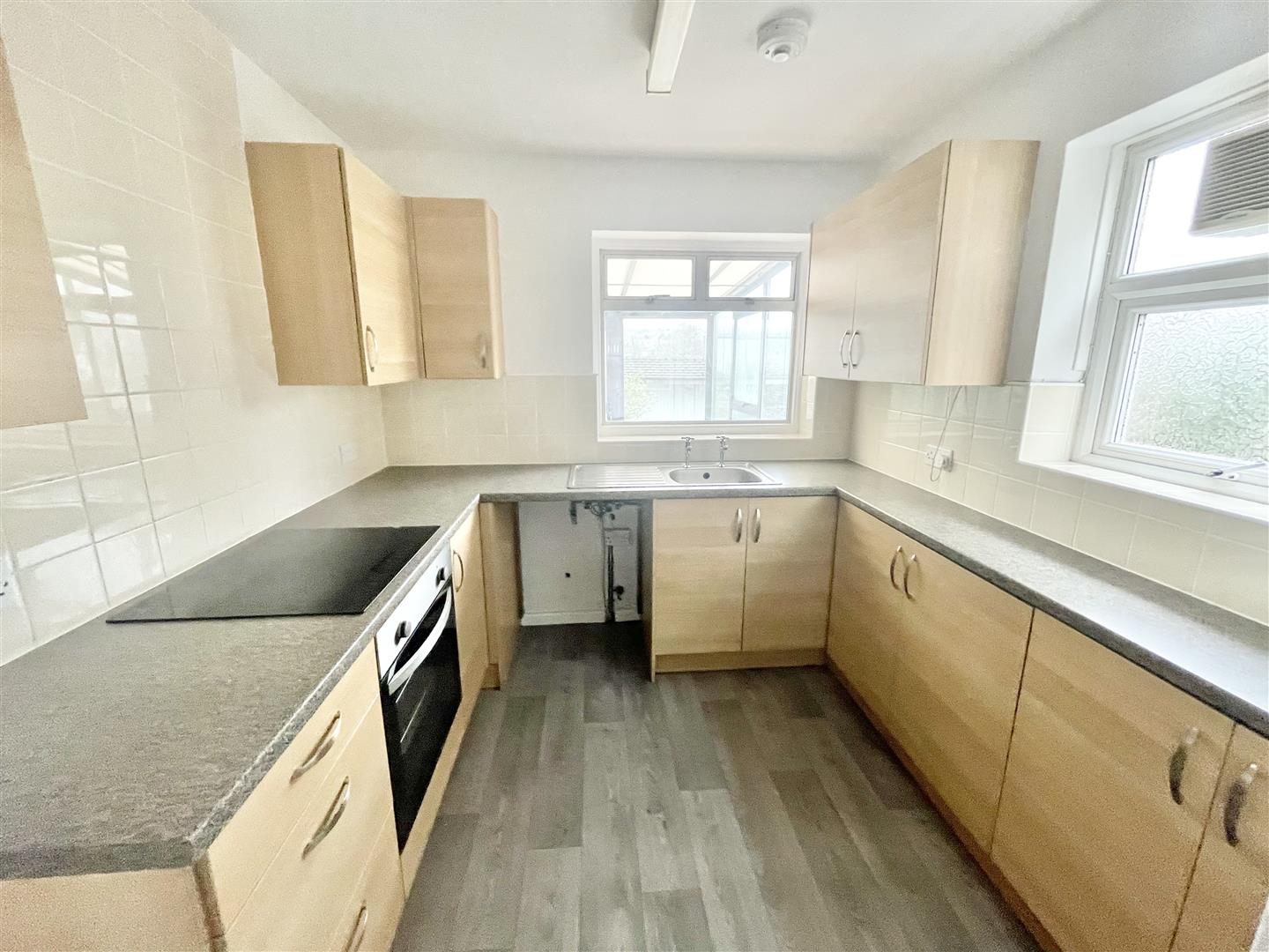 Matching eye-level and base units with roll-edged work surfaces and tiled splash-backs. Inset single-drainer sink unit. Built-in 4-ring electric hob with electric oven beneath. Space and plumbing for washing machine. Space for upright fridge/freezer. Double-glazed windows to the side and rear elevations.