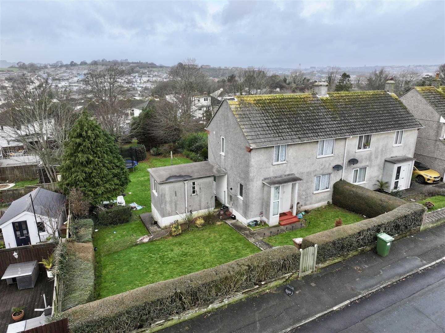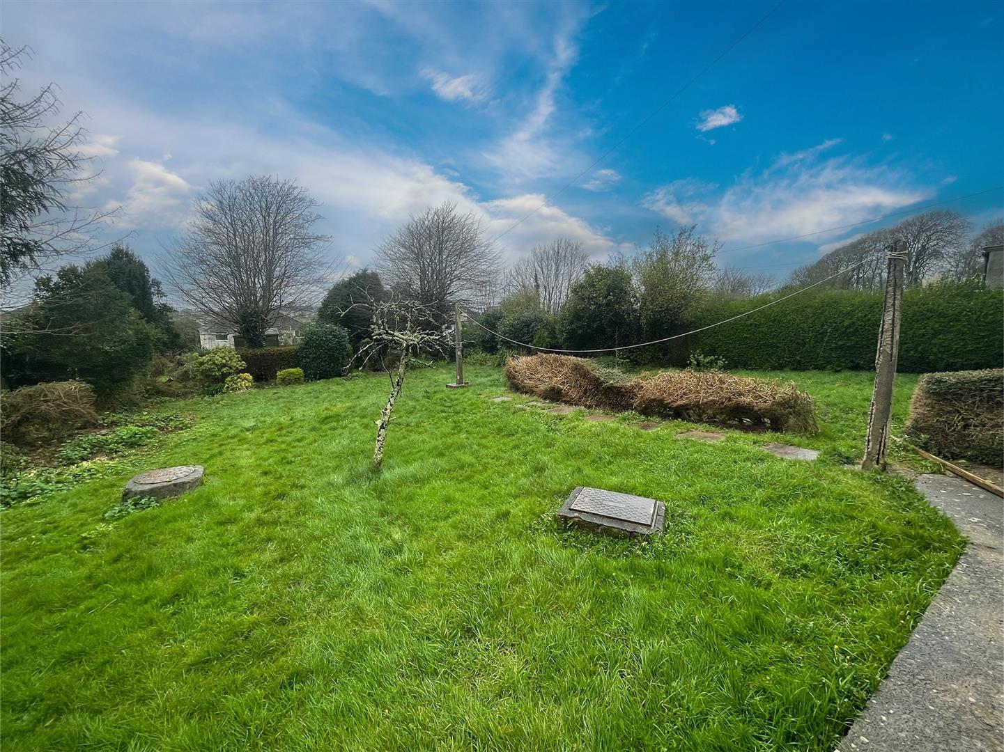 The property is set on a large level plot which is mainly laid to lawn, enclosed by a combination of timber fencing and hedging, with further hedges, mature trees and shrubs within the garden. There is a timber shed at the bottom of the garden. There is a covered area connected to the side of the property which leads to 2 further outside stores.
