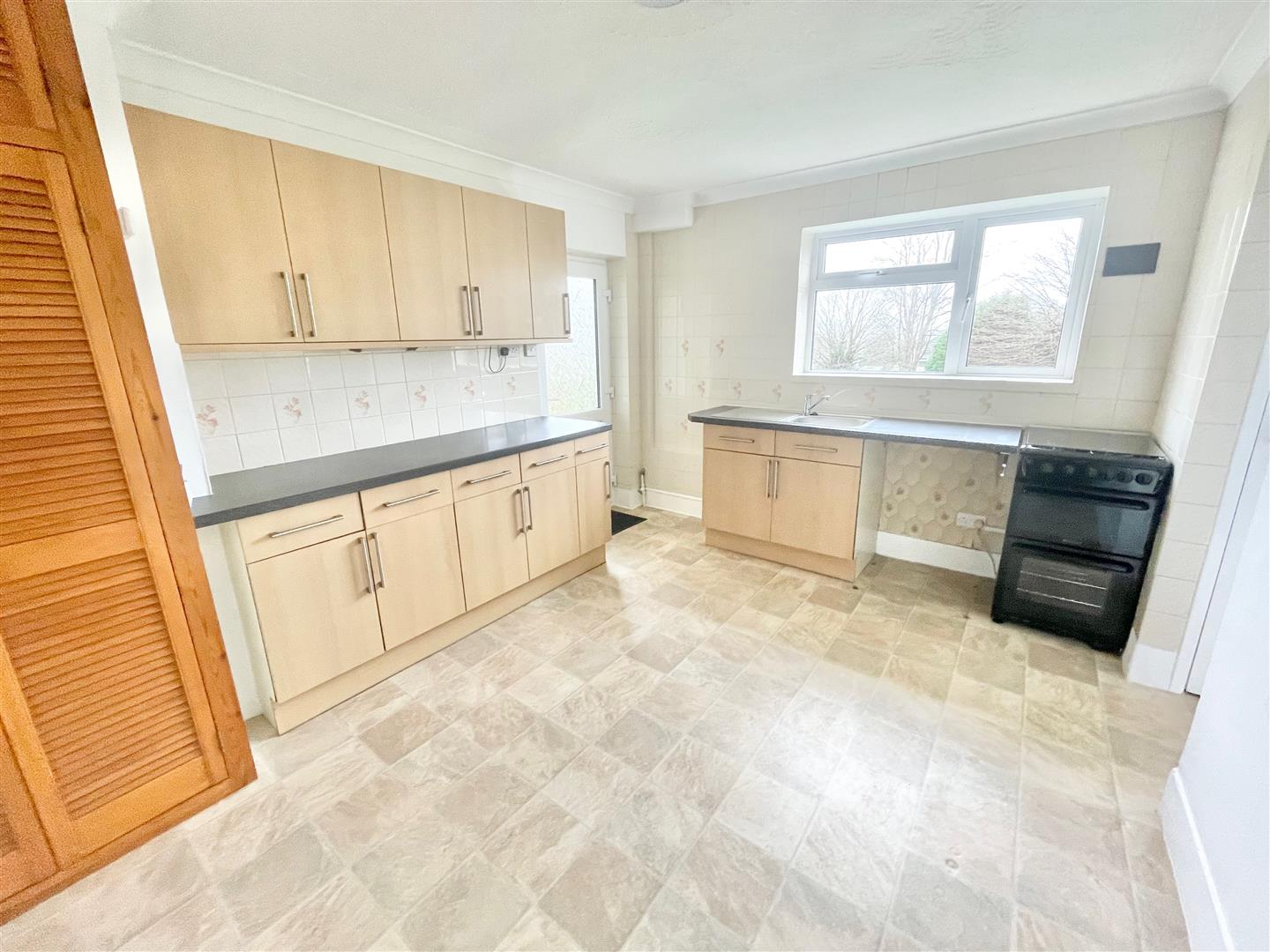 Double-glazed window to the rear. uPVC part-obscured double-glazed door giving access to the covered area at the side of the property. Range of matching eye-level and base units with roll-edged work surfaces. Inset single-drainer sink unit with mixer tap. Cupboard housing the gas boiler. Under-stairs storage cupboard housing the gas meter and electric consumer unit. Additional larder cupboard.