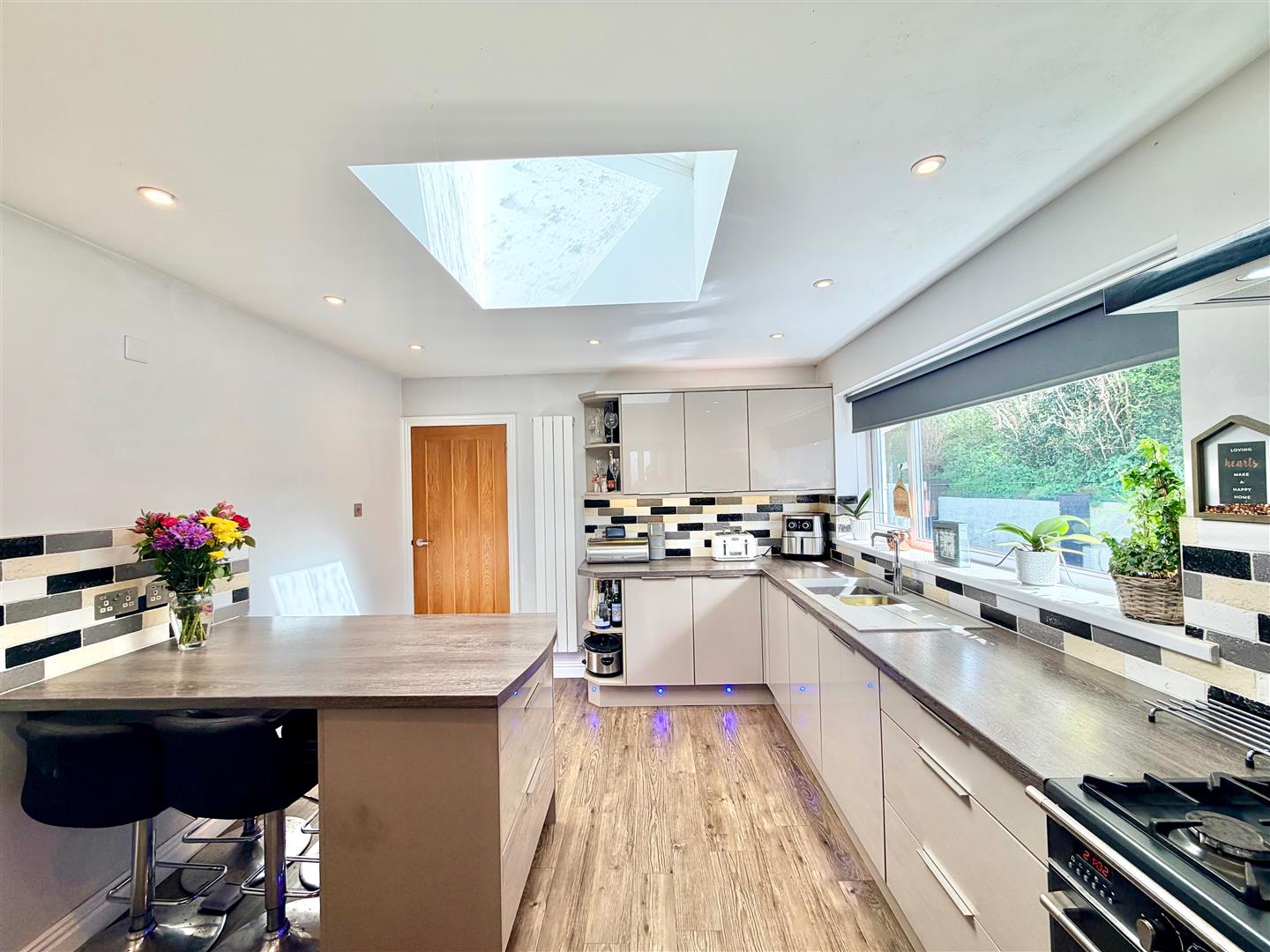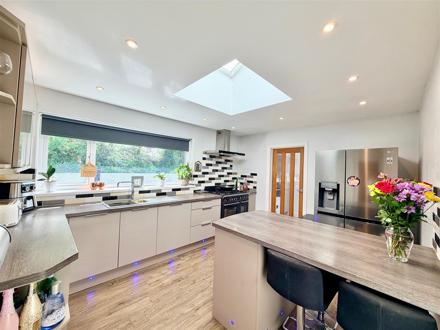 Fitted with a range of modern cabinets with matching fascias, work surfaces and tiled splash-backs. Breakfast bar. Range-style cooker with a cooker hood above. Inset one-&-a-half bowl single drainer sink unit. Space for American style fridge-freezer. Integral dishwasher. Plinth lighting. Inset ceiling spotlights. Window to the side elevation. Velux skylight. Doorway leading into the utility room.