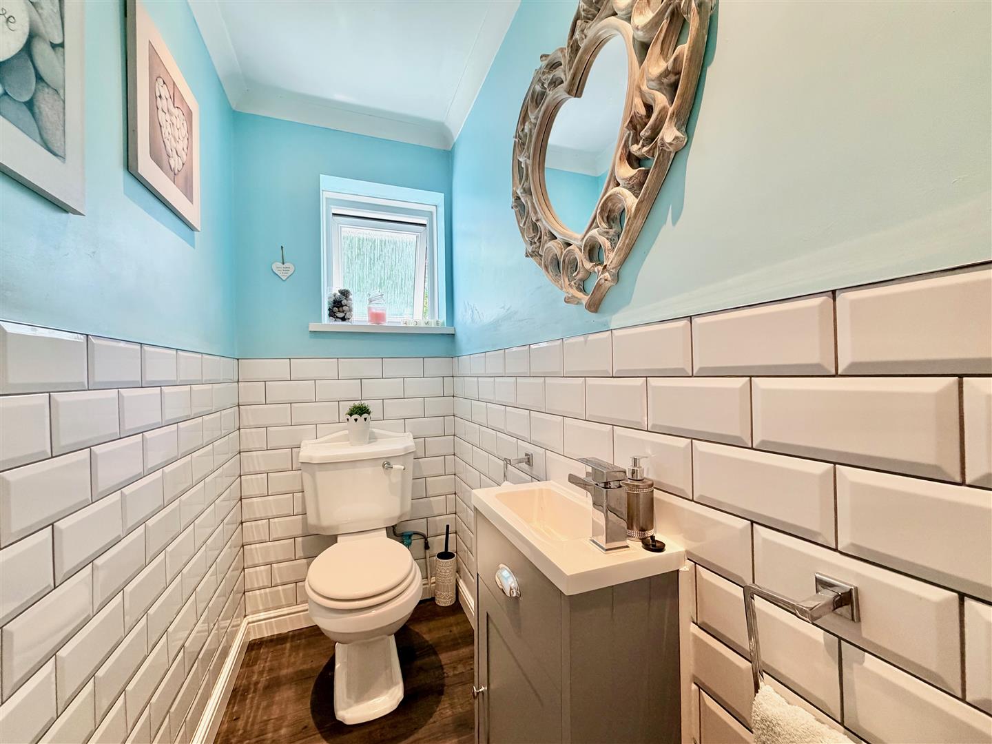 Fitted with a wc and wash hand basin. Partly-tiled walls. Inset ceiling spotlights. Obscured window.