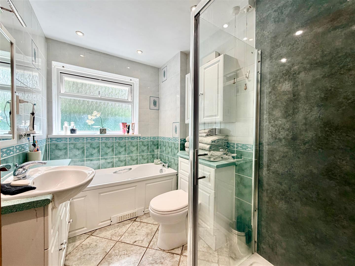 Comprising a bath, separate shower with waterproof panelling, wc and basin. Towel rail/radiator. Tiled walls. Inset ceiling spotlights. Obscured window.