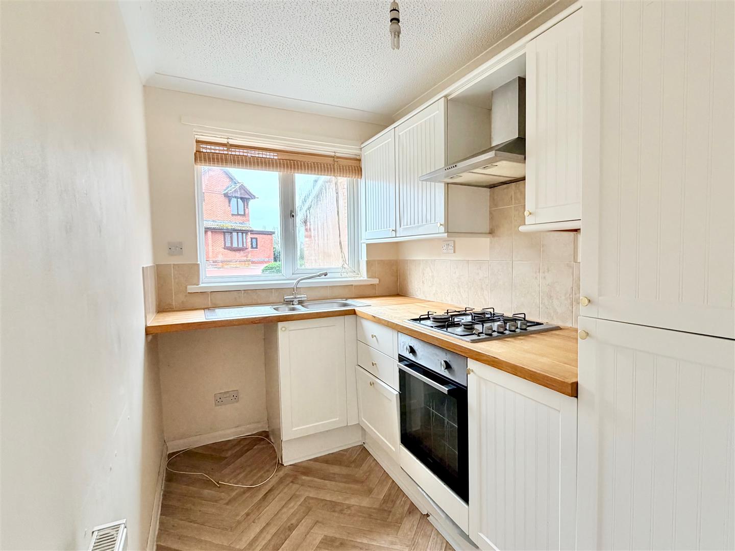 Fitted with a range of base and wall-mounted cabinets with matching fascias, hard wood work surfaces and tiled splash-backs. Stainless-steel one-&-a-half bowl single drainer sink unit. 4-burner gas hob with a cooker hood above. Built-in oven. Integral fridge and freezer. Space and plumbing for washing machine. Window to the front elevation.