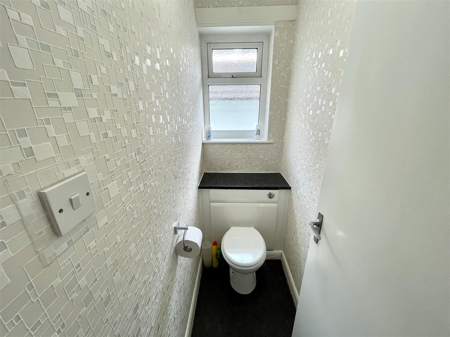 Obscure glazed window to the side. White modern close coupled wc with concealed cistern.