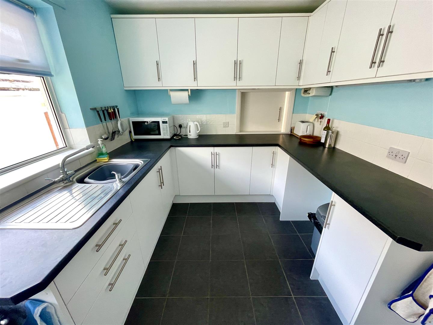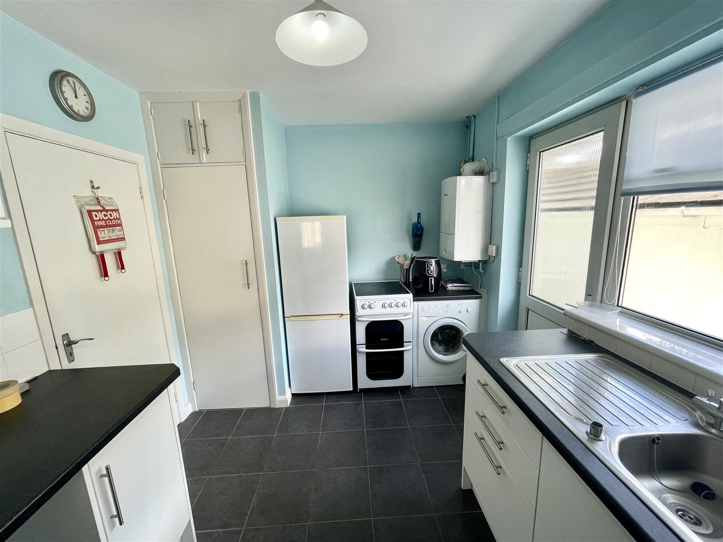 PVC part double glazed door and adjoining double glazed window to the side. Fitted with a range of cupboard and drawer storage. Roll edge work surfaces with tiled splashbacks, stainless steel sink with mixer tap. Wall mounted 'Worcester' gas fired boiler servicing central heating and domestic hot water cupboard housing mains gas meter, mains electric meter and consumer unit, spaces for free standing appliances.