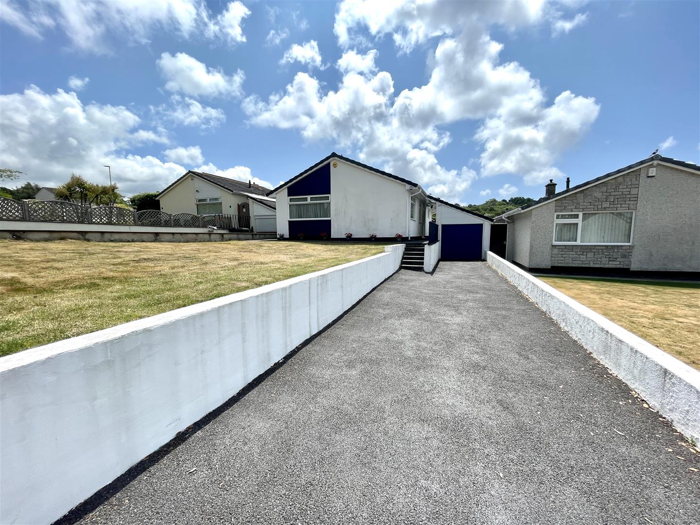 A wide entrance opens into a long drive wide, double length with ample space for two vehicles in line, narrower as it approaches the garages. With pathways leading via pedestrian gates along both sides of the rear. Here at the back a wide paved patio next to the lounge/dining room and beyond a lawned garden enclosed by timber overlap fencing. Long views from the rear patio towards nearby woodland.
