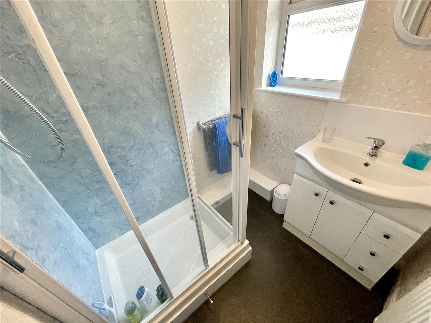Patterned obscure glazed window to the side. White modern suite with vanity wash hand basin with mixer tap, cupboard and drawer unit under, shower with 'Mira' thermostatic shower control and aqua panels.