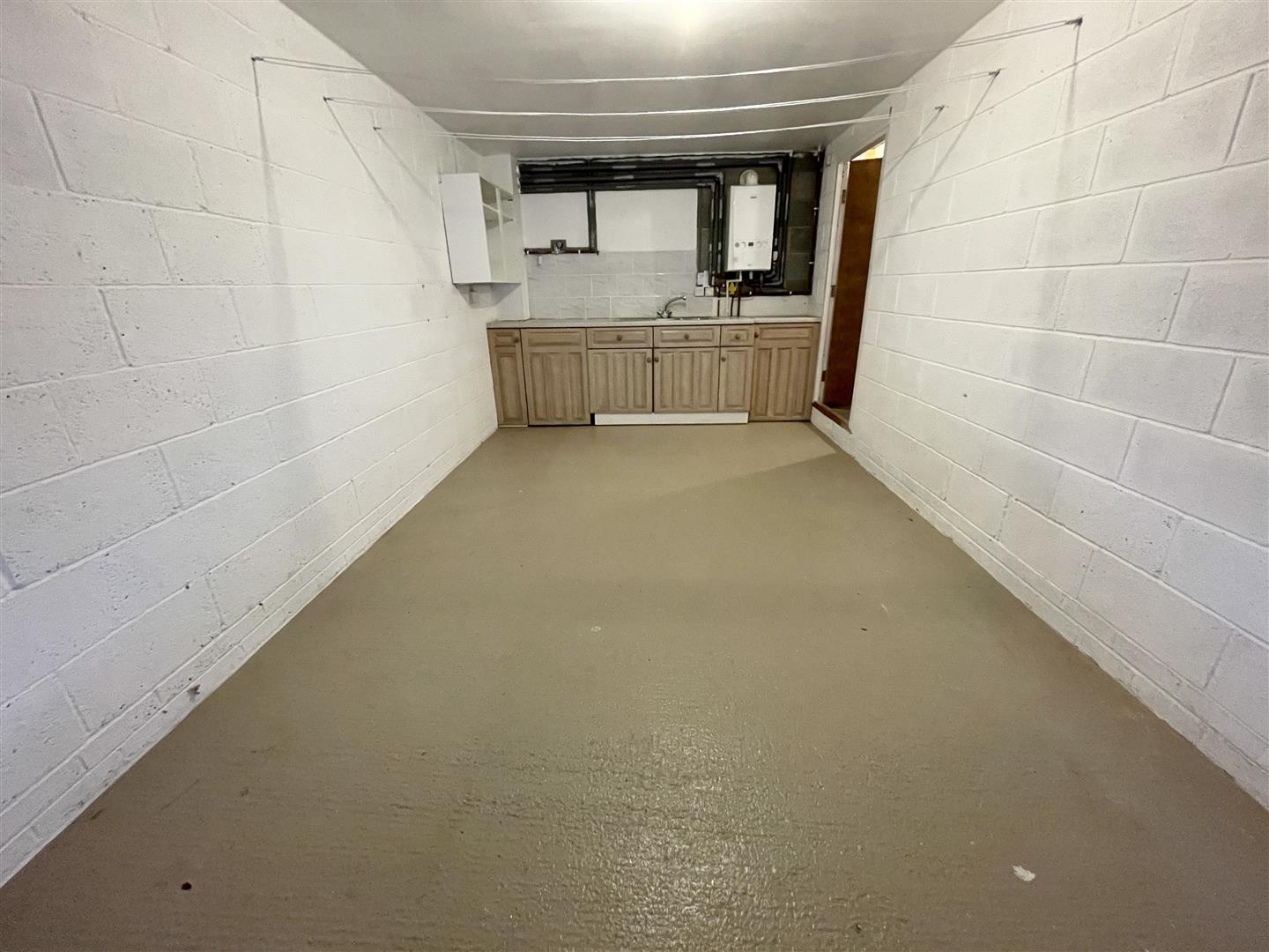 Up and over front door. Power points and lighting. Kitchen style units to the end with inset one and a half bowl stainless steel sink, cupboard and drawer storage. Wall mounted 'Ideal Logic combi ESP135' boiler servicing central heating and domestic hot water. Door to: