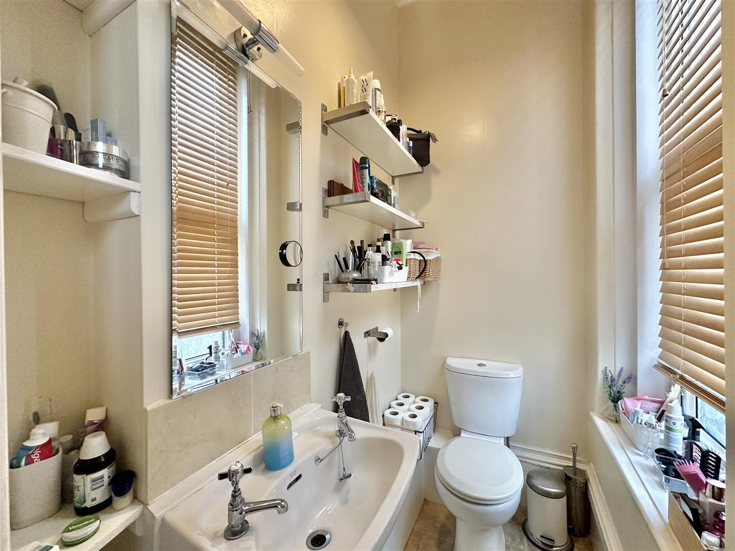 Modern fitted with WC and wash hand basin. Range of cupboard storage.