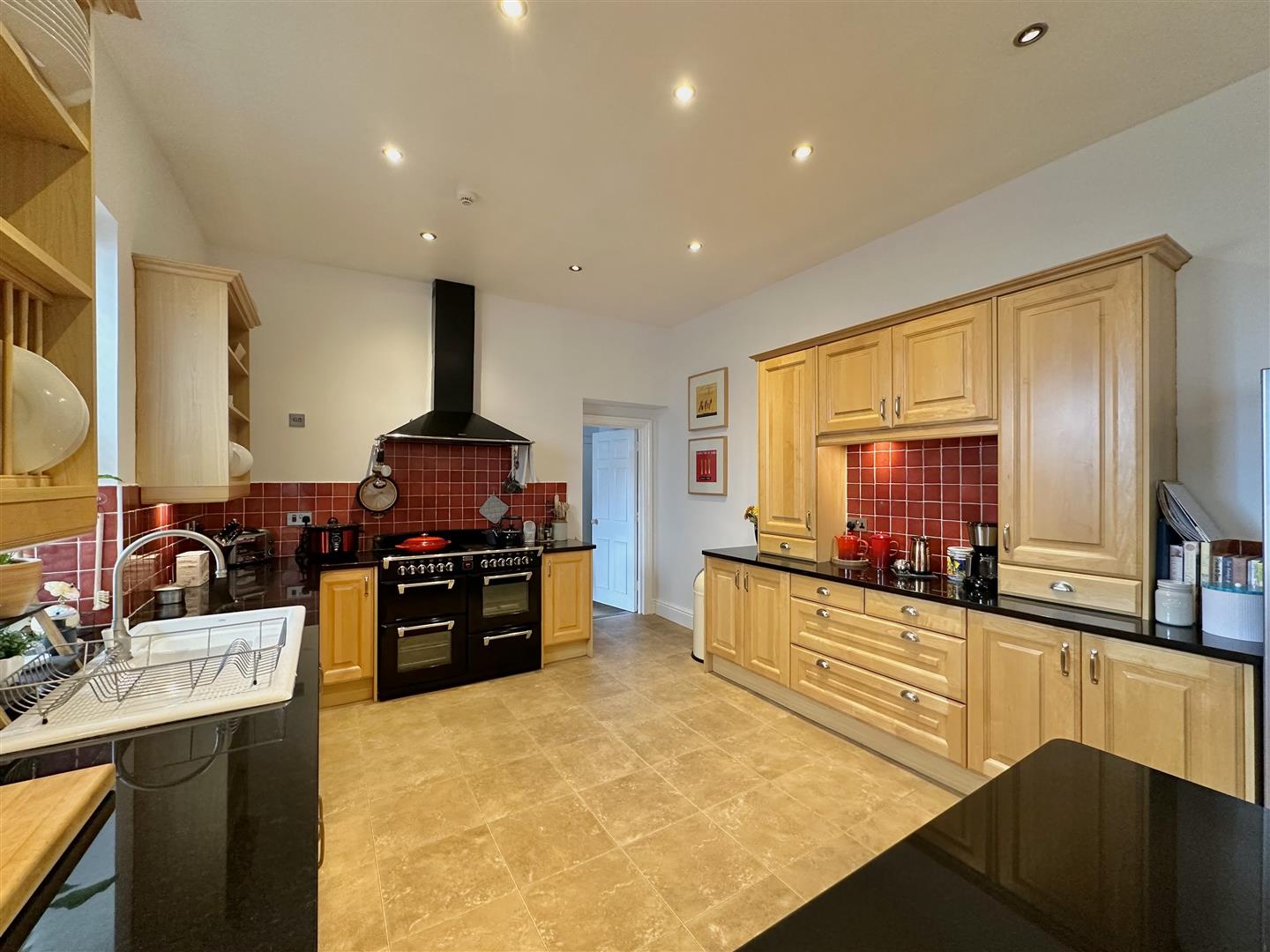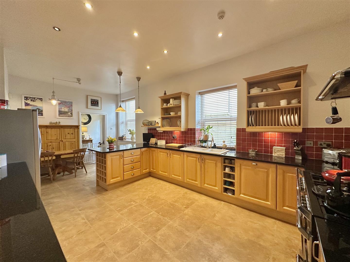 High quality fitted integrated kitchen with Zimbabwe granite work surfaces. Range of features including an excellent range of cupboard and drawer storage. One and half bowl sink nit. Quality integrated appliances with dishwasher and range style cooker. Impressive dresser style unit. Door to: