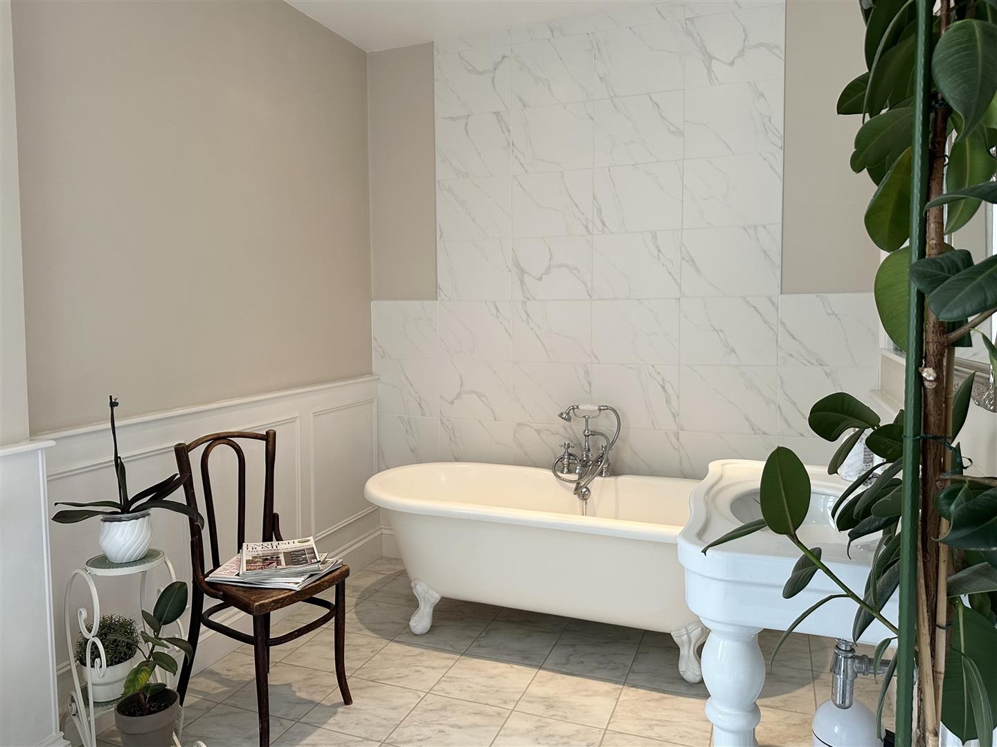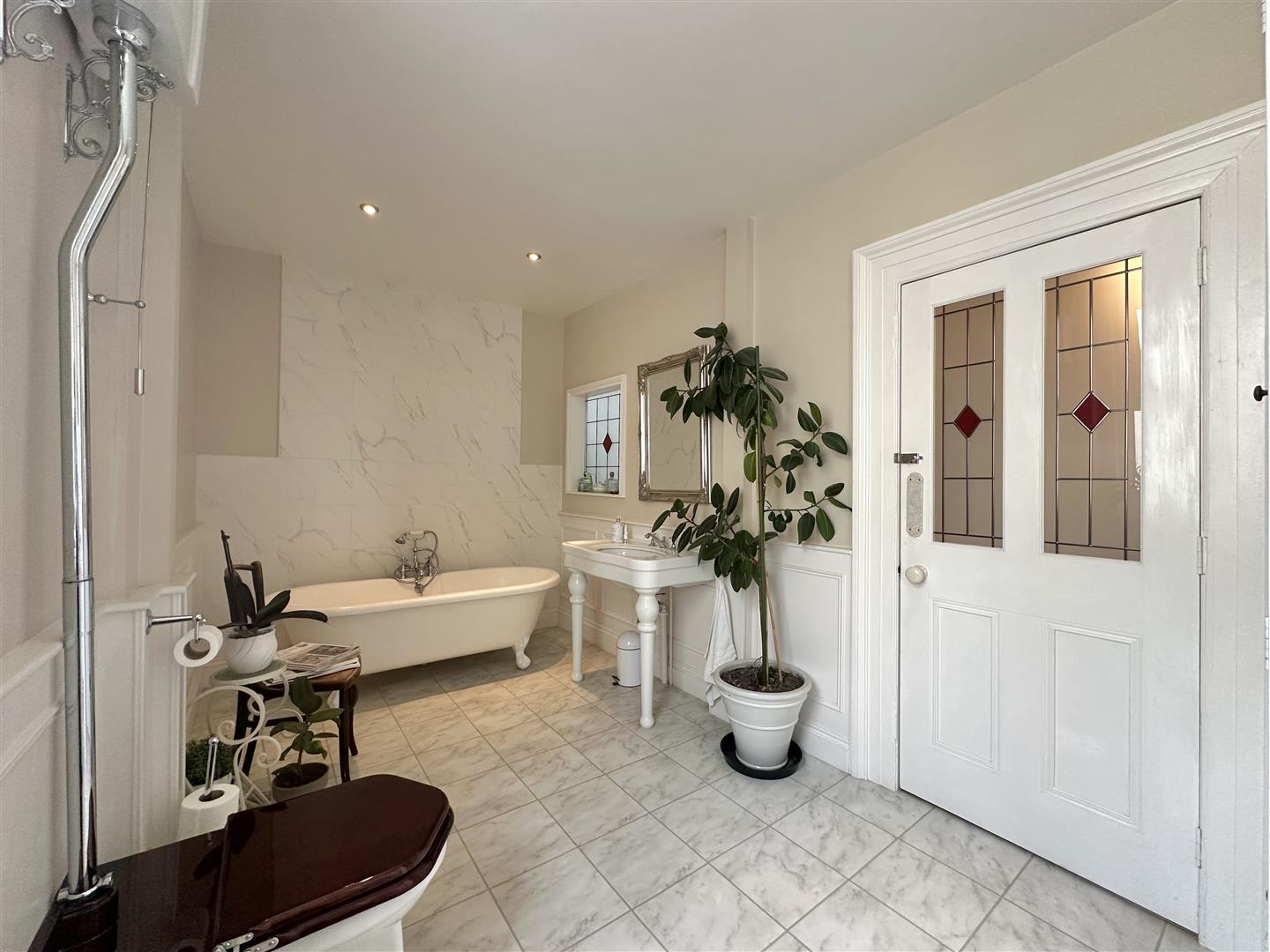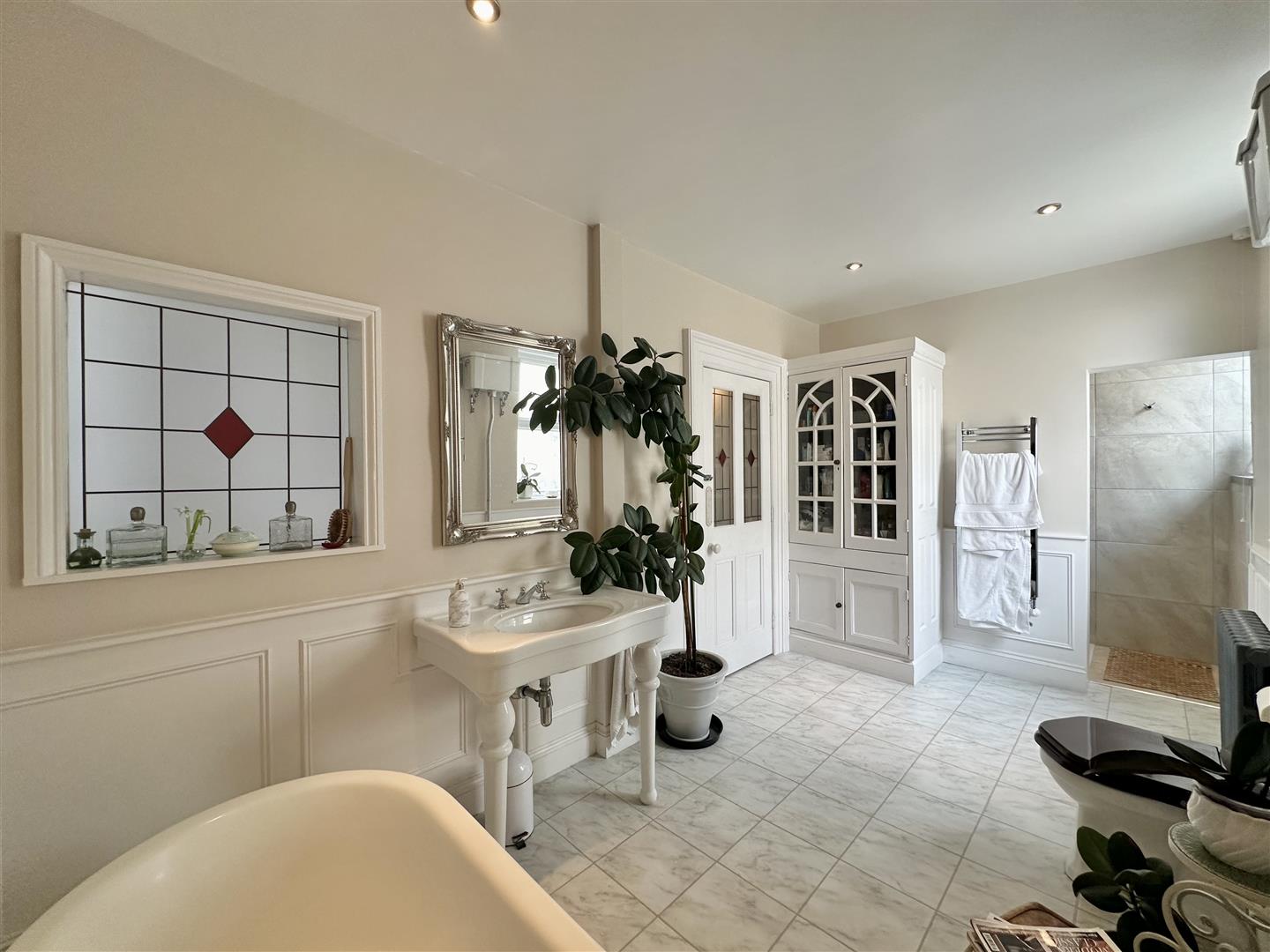 Quality suite including free standing bath, vanity wash hand basin, close coupled WC, storage cupboard and walk in large tiled shower.