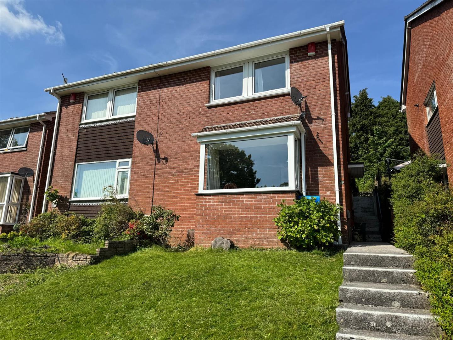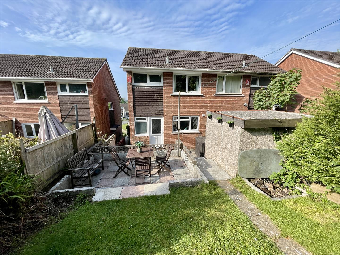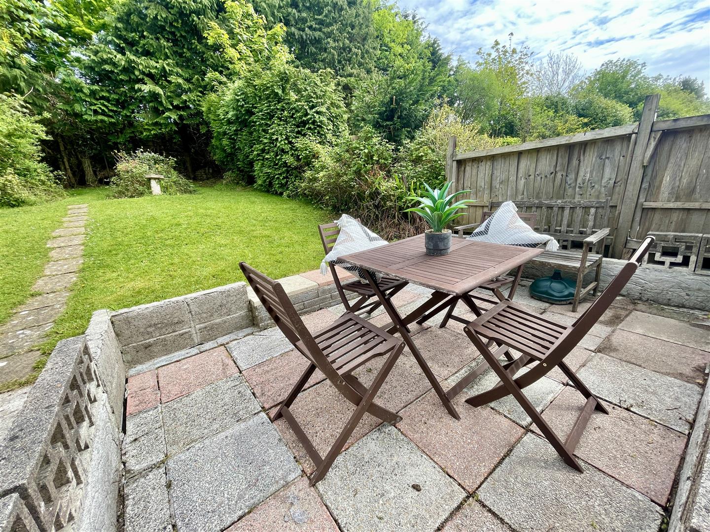 Lawned front garden with stepped path leading up to the front door set on the side of the property. Side access to the generous size enclosed back garden with a level area next to the property and steps up to a useful garden store and adjoining this, a paved patio ideal for alfresco entertaining. Beyond, a long lawned garden, gently sloping up with hedge boundaries. Located in a close by block is a single size GARAGE with black door.