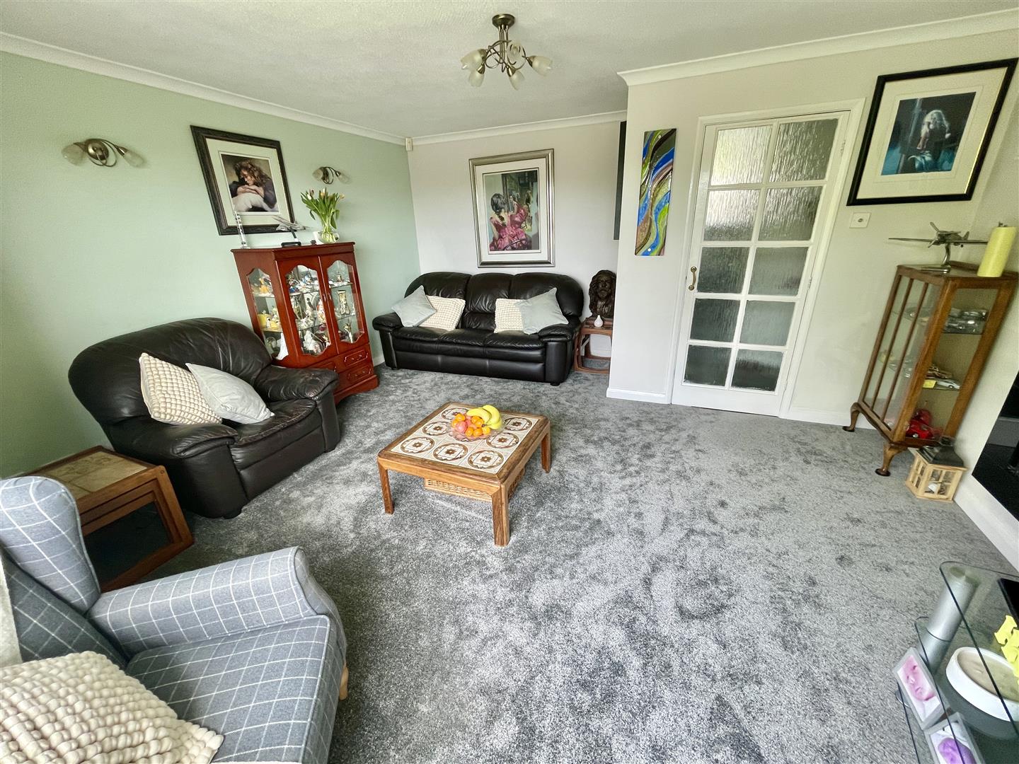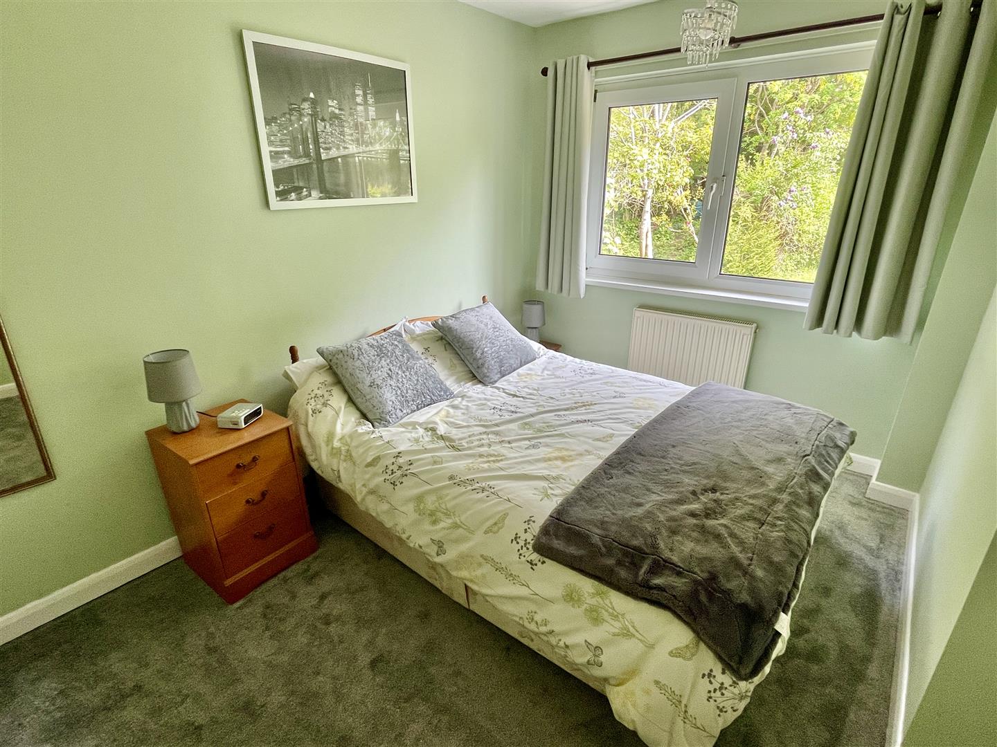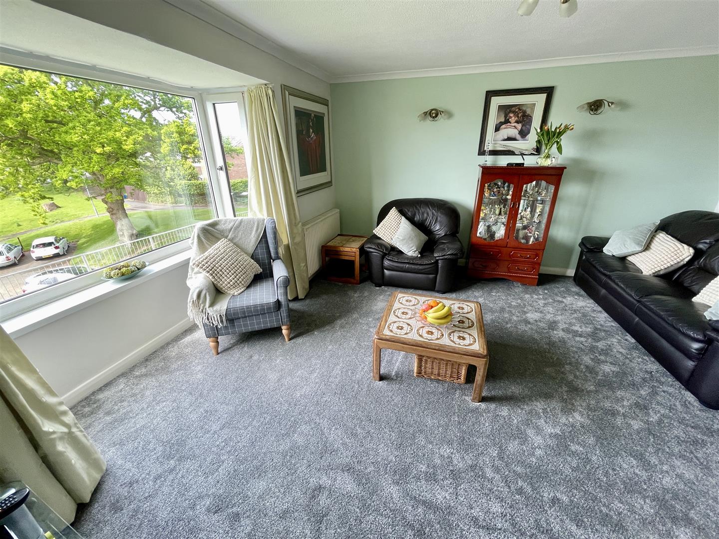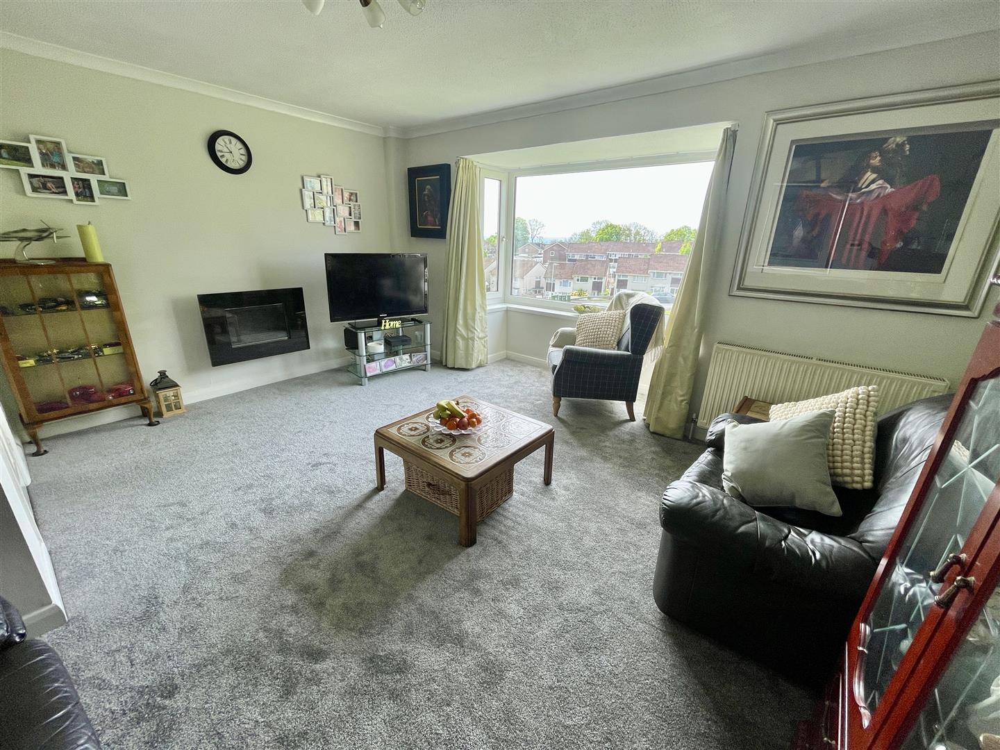 Wide box bay window to the front elevation with far reaching views. Coved ceiling and five bulb light point. Raised wall mounted electric fire.