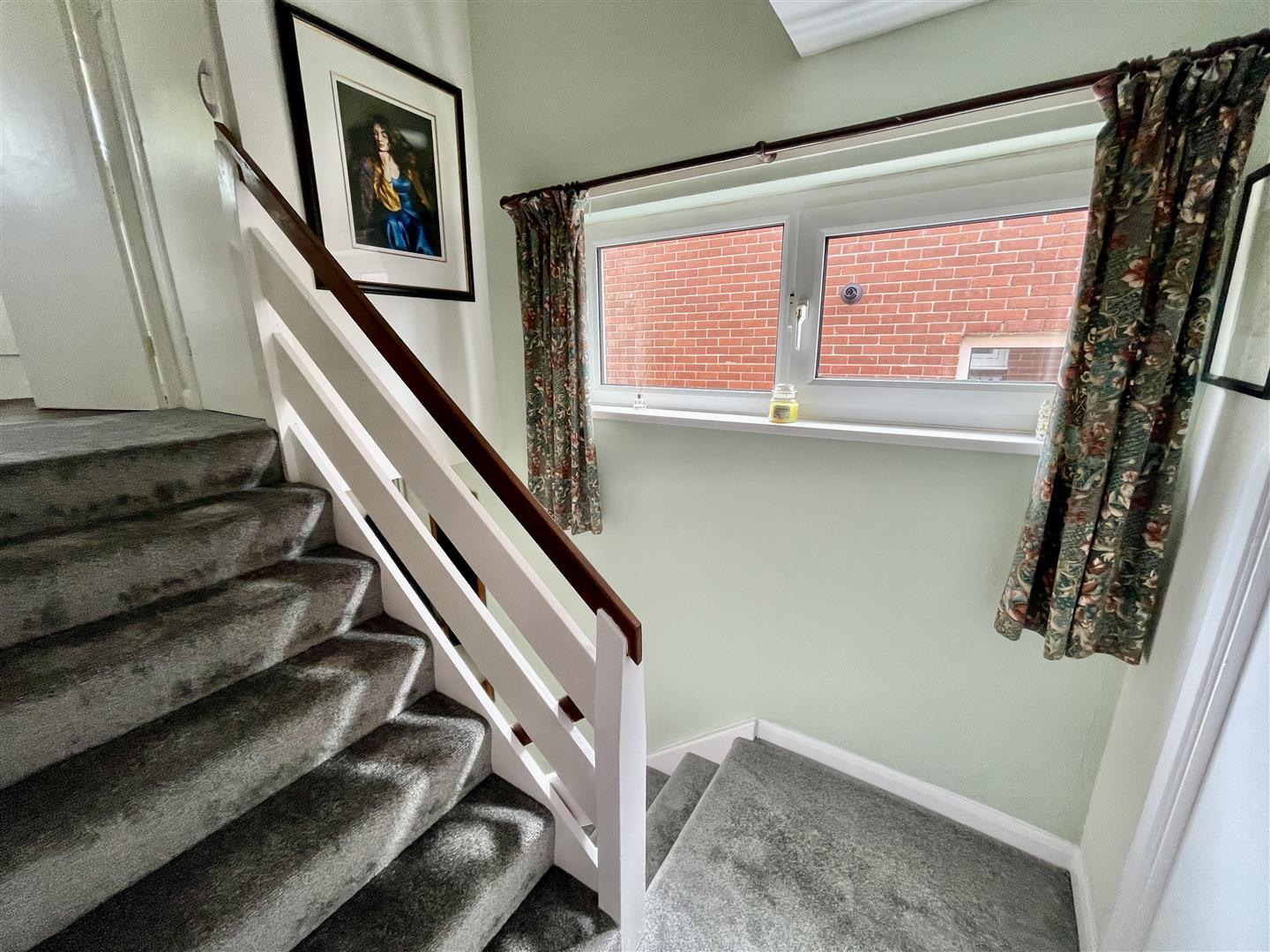 Staircase with carpeted treads rises to the first floor. Useful adjoining under stairs storage cupboard housing the mains electric meter and new consumer unit.