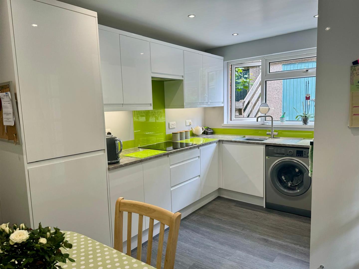 Widow overlooking the back garden. Modern fitted quality integrated kitchen with a good range of cupboard and drawer storage set in wall and base units. Roll edge work surfaces with glass tiled splash backs. Inset stainless steel sink with chrome mixer tap. Quality integrated appliances include electric fan assisted oven, microwave, four ring variable size Schott Ceran hob with glass splash back and extractor hood over and integrated fridge/freezer. Space and plumbing suitable for automatic washing machine. Six down lighters.