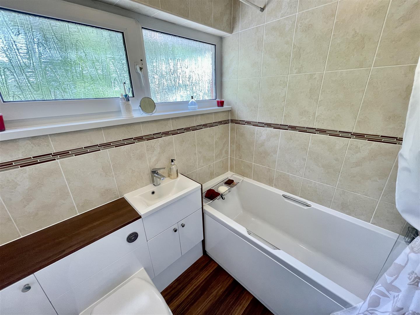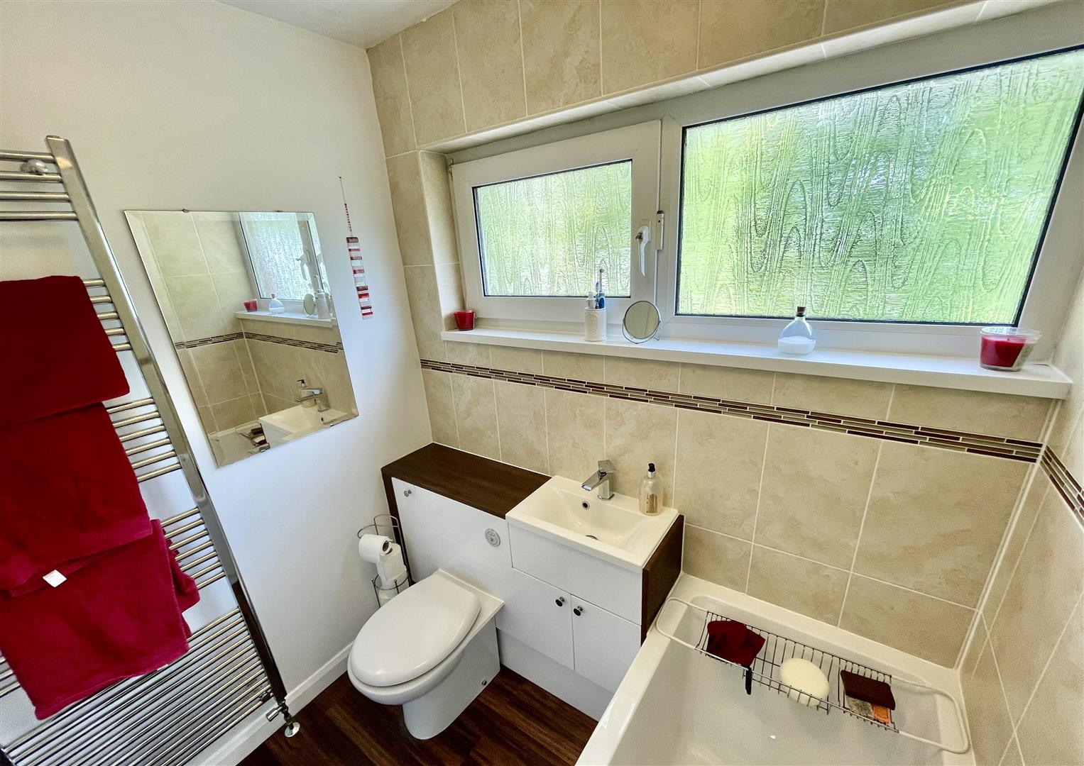 Obscure double glazed window to the rear. Quality white modern suite comprising twin grip panelled bath with mixer tap and separate thermostatic shower over incorporating handheld mixer and overhead douche spray. Unit with vanity wash hand basin, cupboard under and close coupled WC. Ladder radiator.