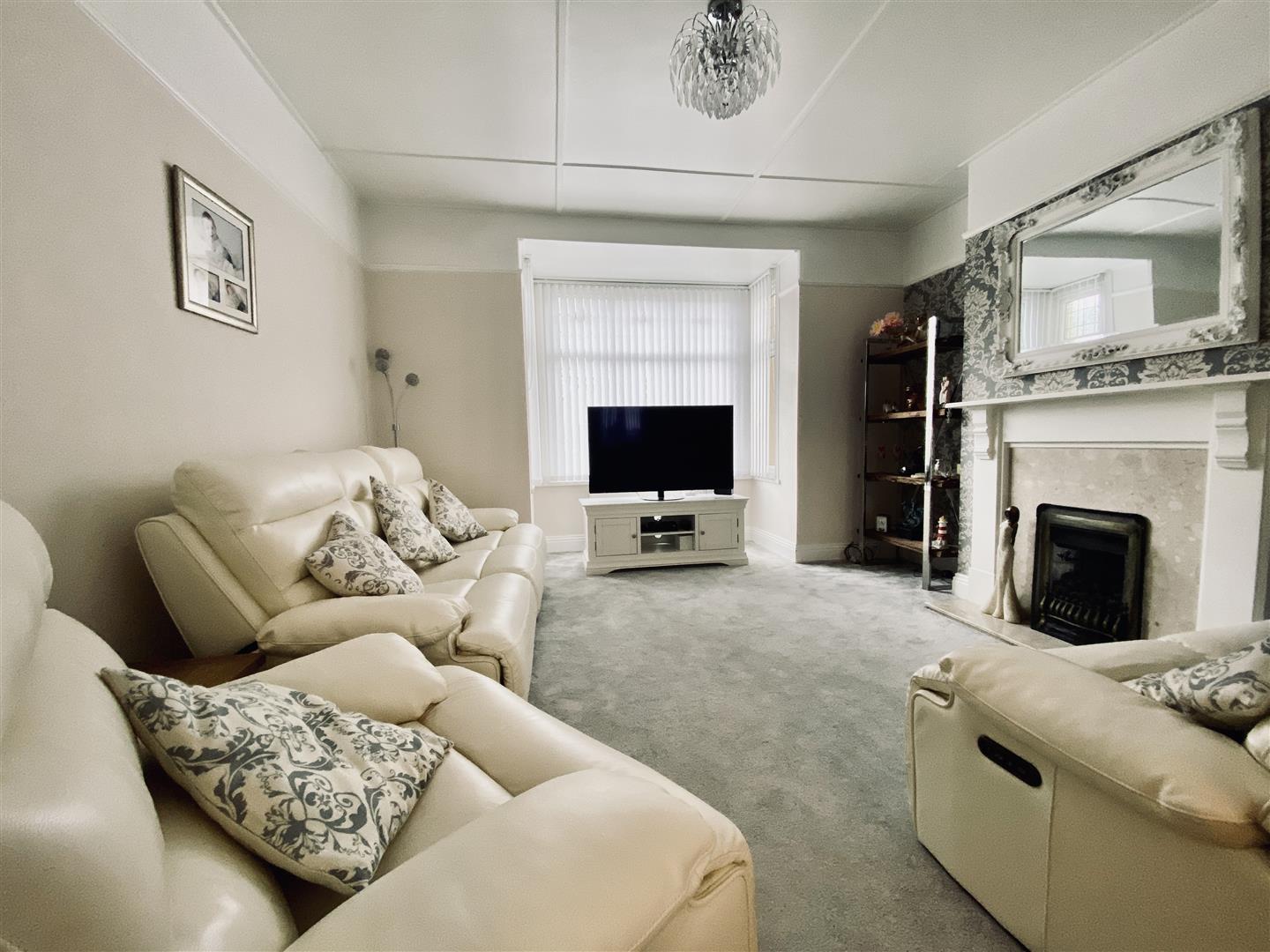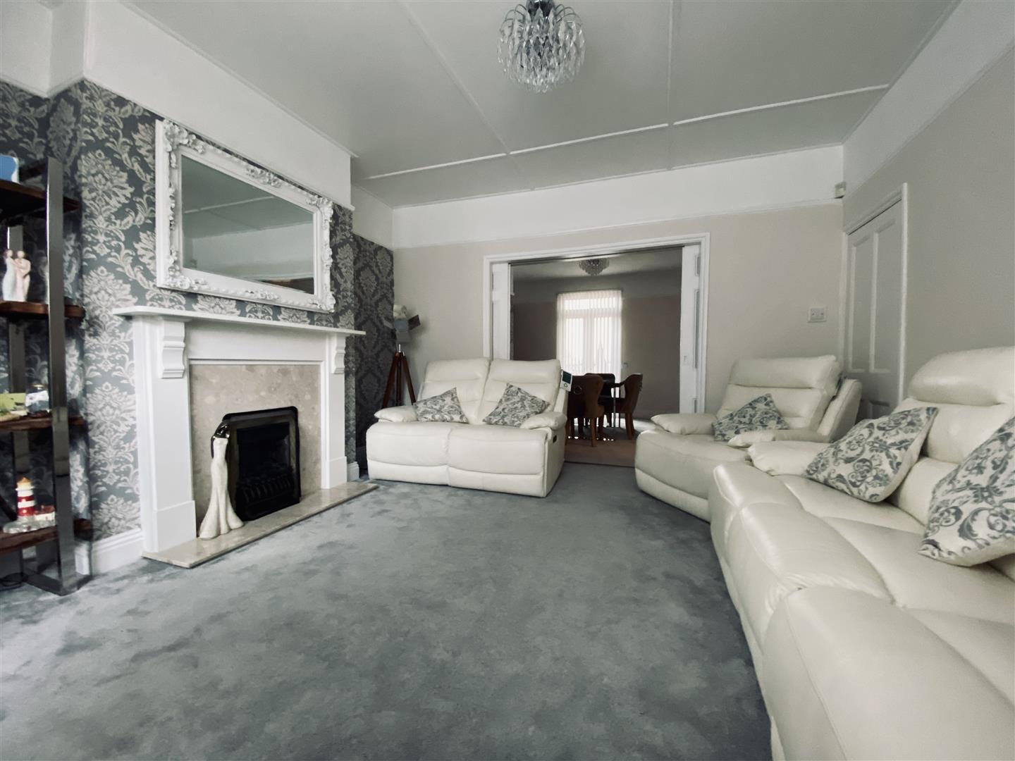Feature fireplace with wood mantel, marble inset, hearth and inset living flame gas fire. Picture rail. uPVC double glazed square bay window to front. Twin sliding doors open into;