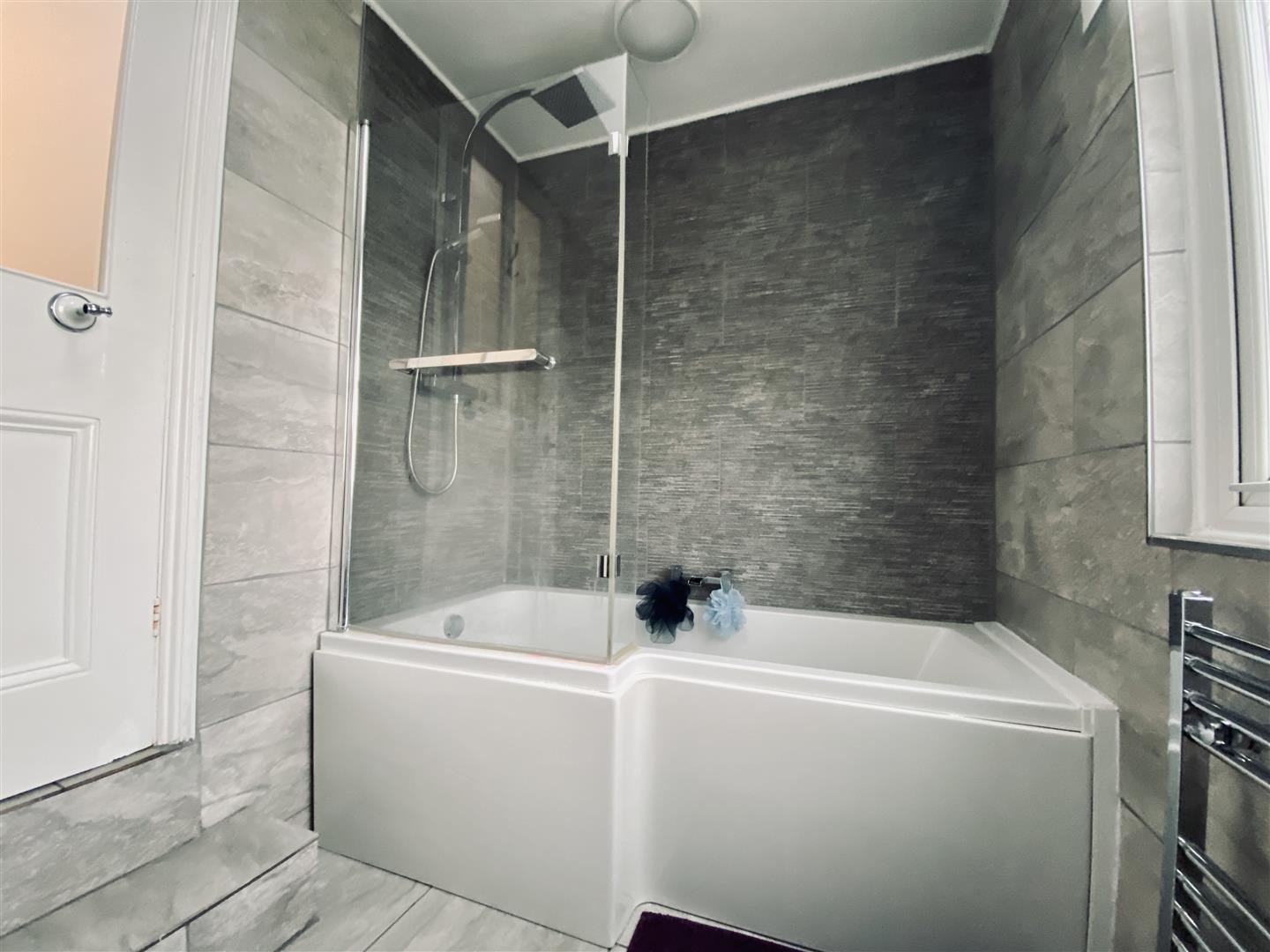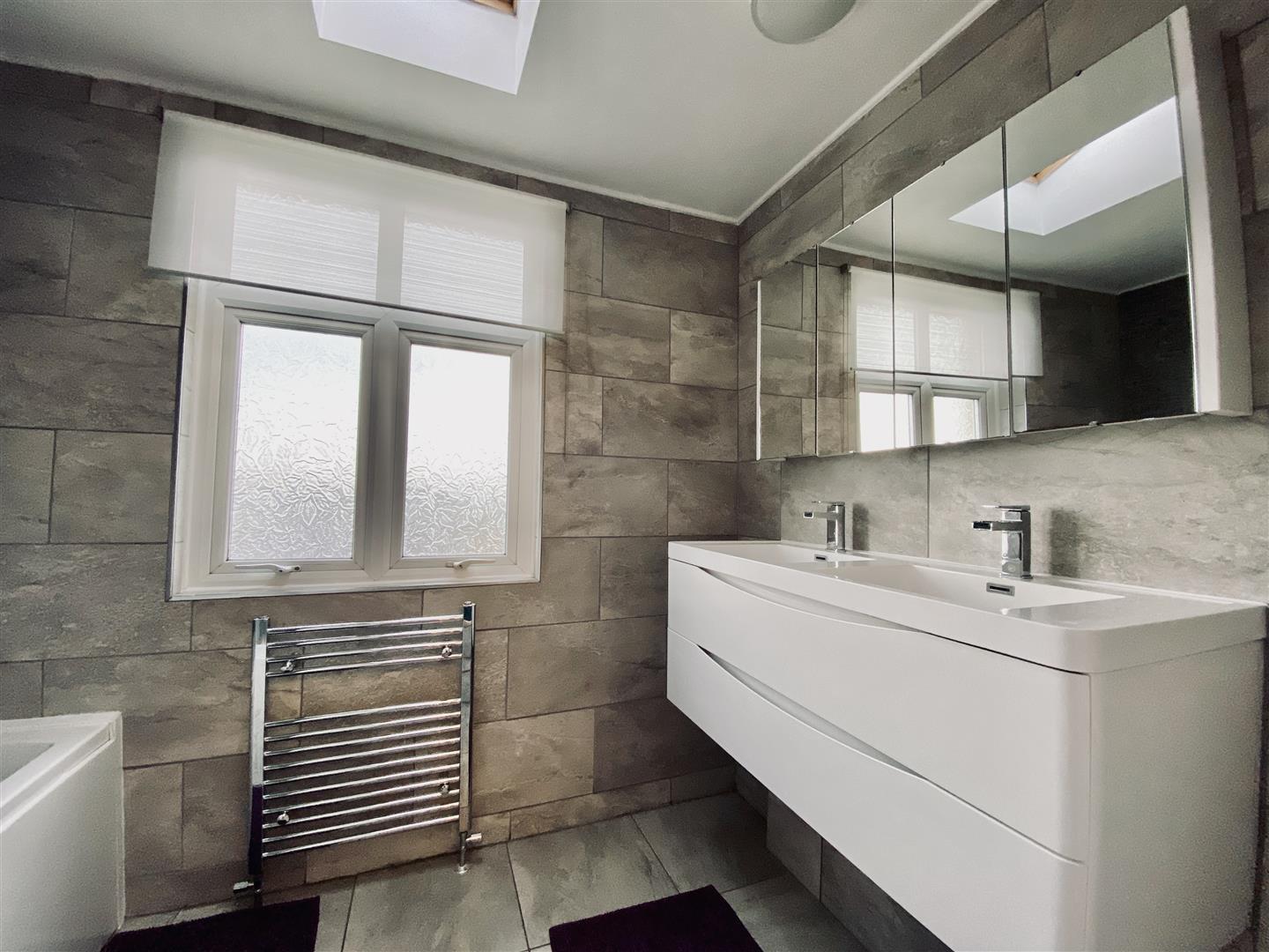 Matching suite of L-shaped bath with shower over with twin shower heads, Rainfall and handheld. Twin sink units inset into white high gloss vanity storage drawers below. Wall mounted mirrored medicine cabinets. Chrome heated towel rail. Tiled walls. Tiled floor. uPVC obscured double glazed window to rear.