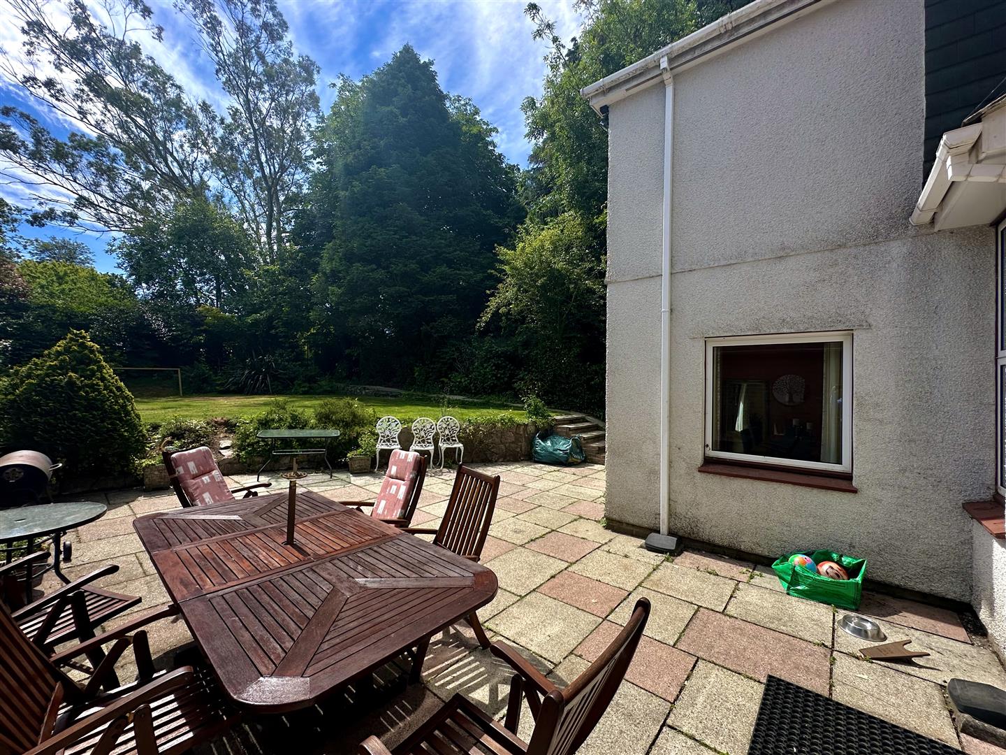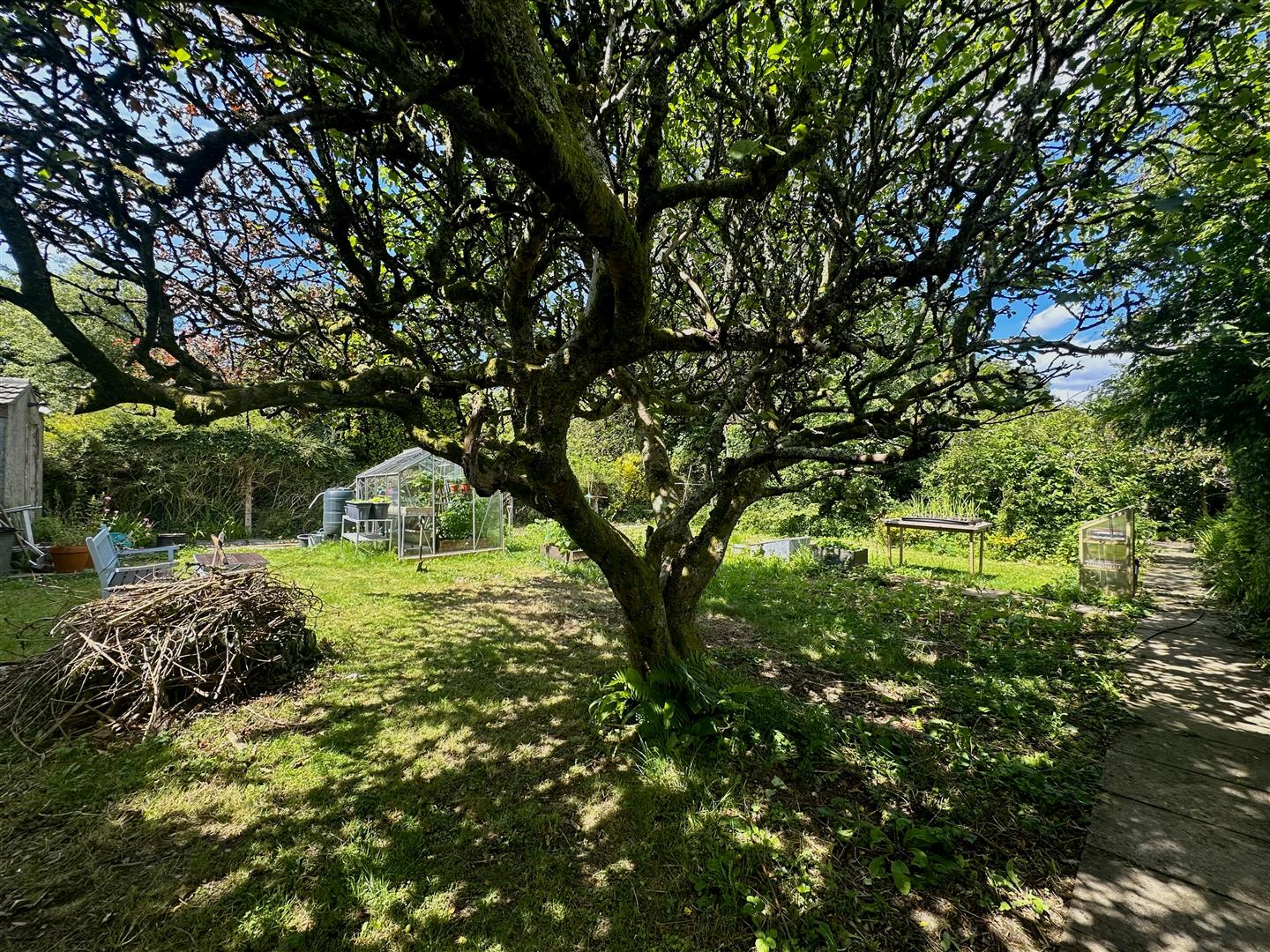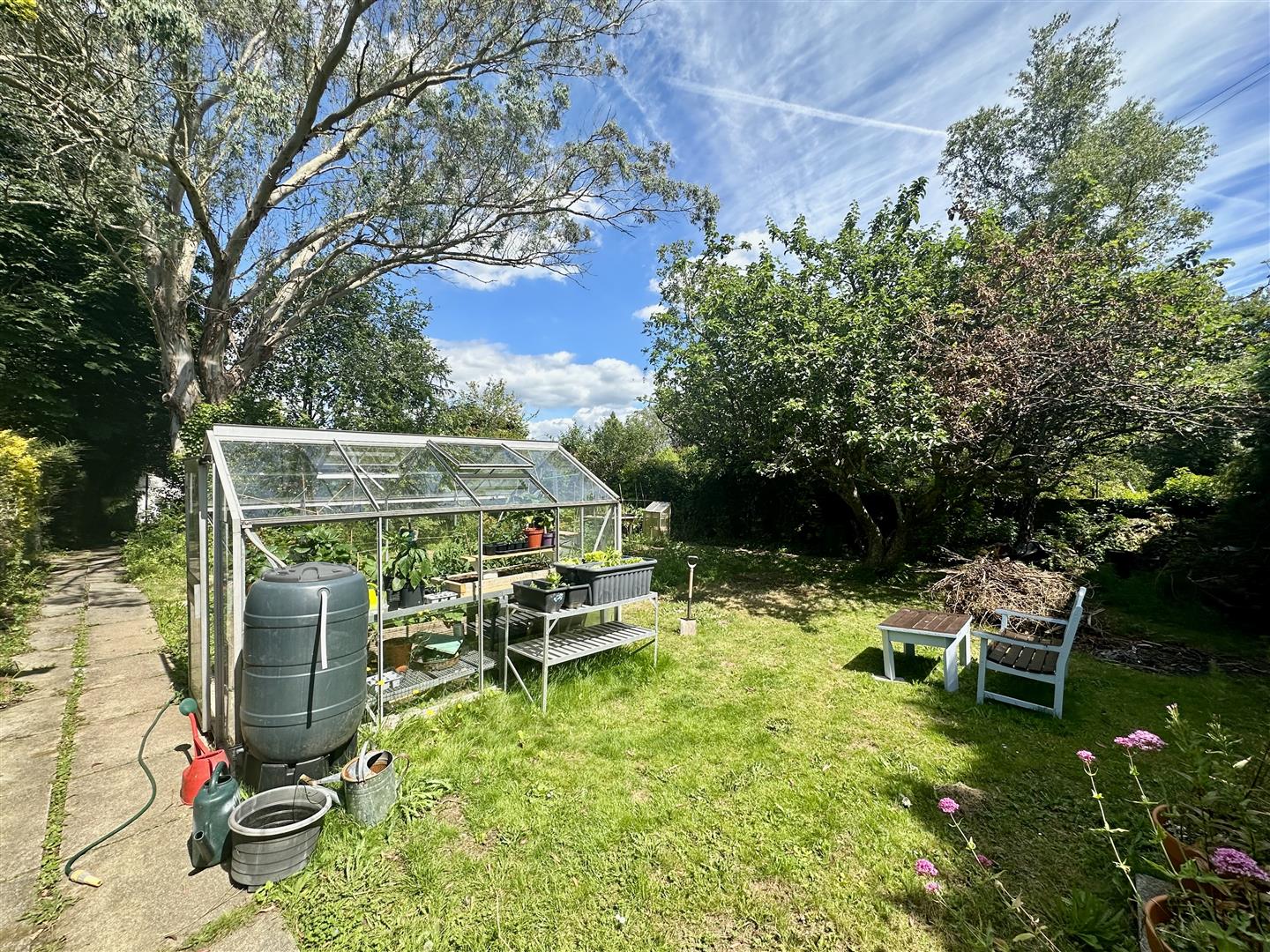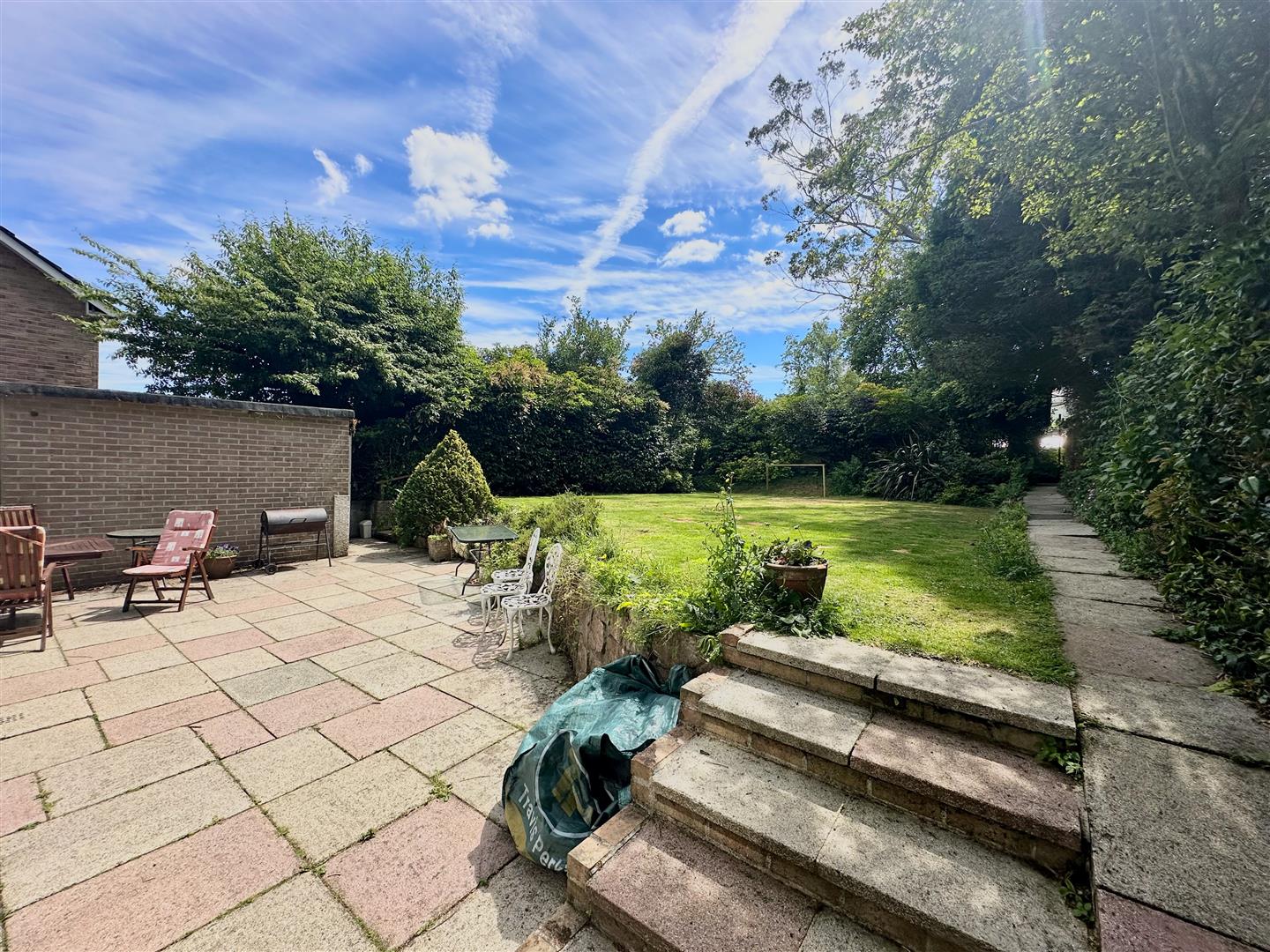 A mature front garden with lawn, shrubs and bushes and parking for up to four or five vehicles, a large garage/workshop and to the rear a large enclosed back garden with patio, lawn and a separate kitchen garden area.