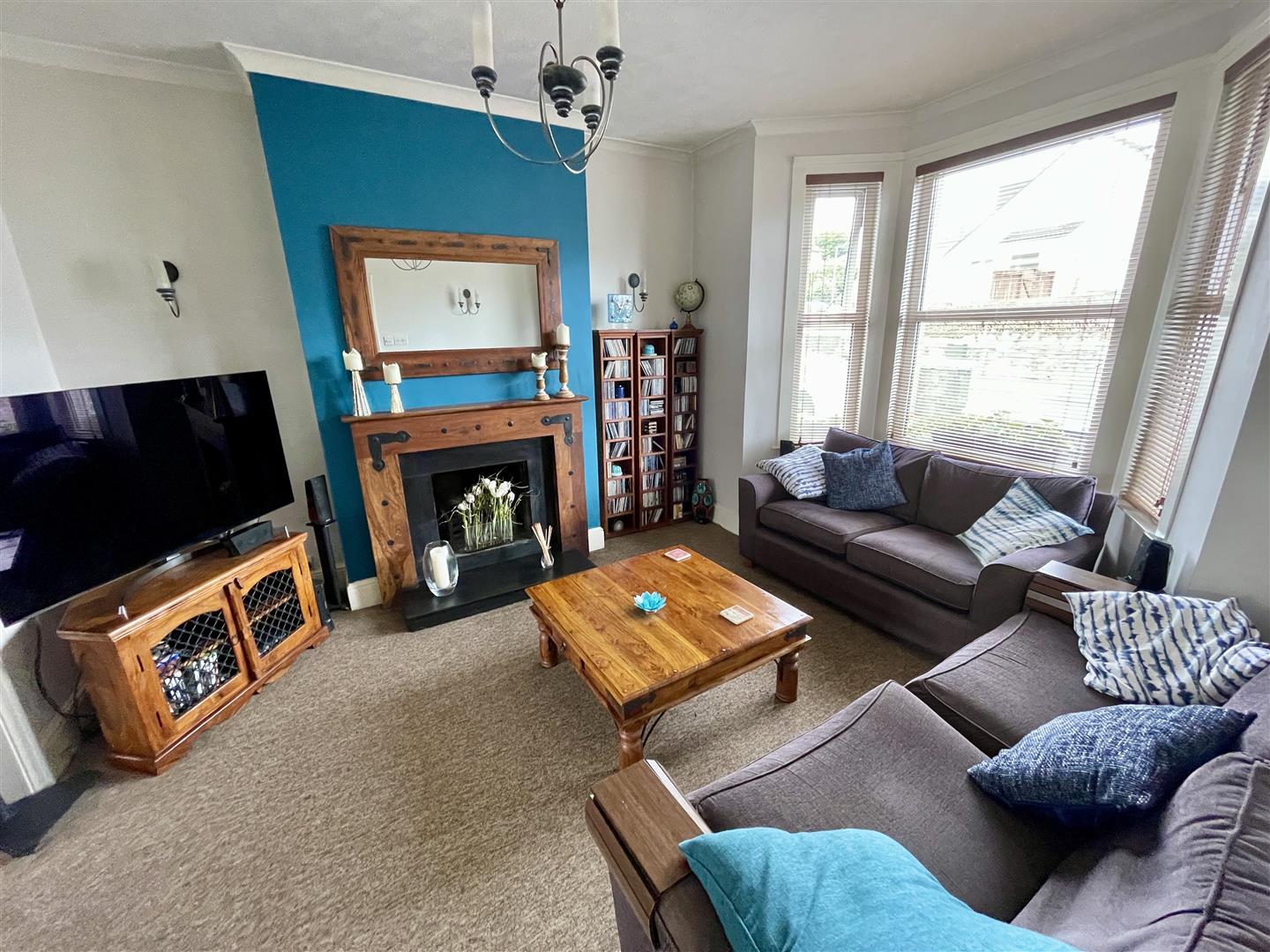 Bay window to the front. Focal feature fireplace with timber surround and open grate. Double sliding doors to: