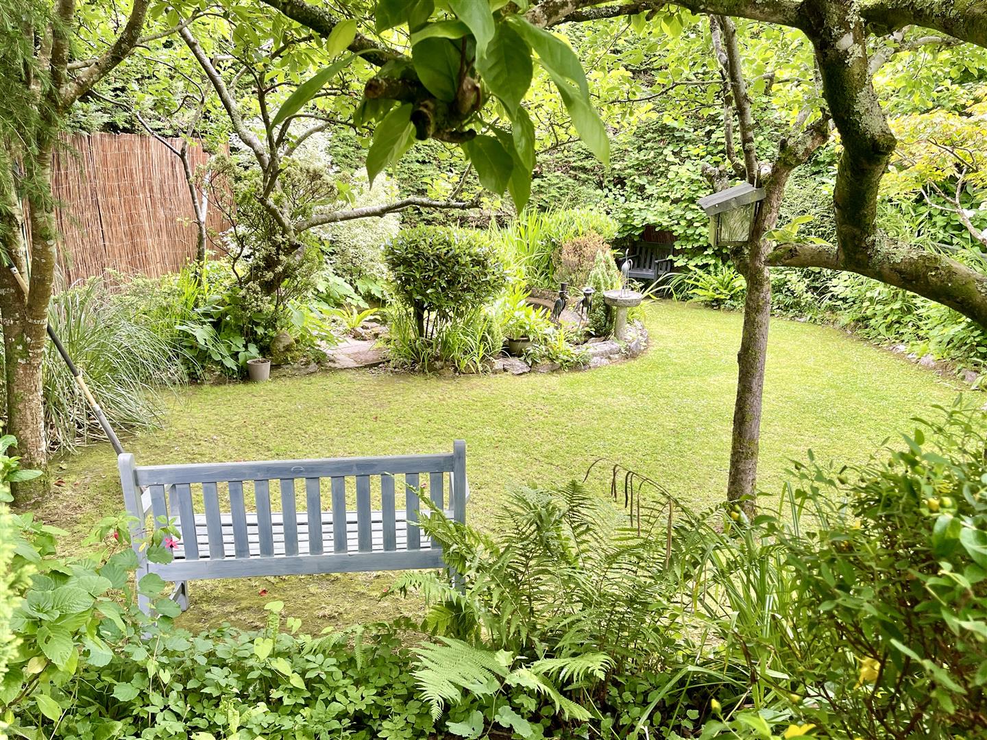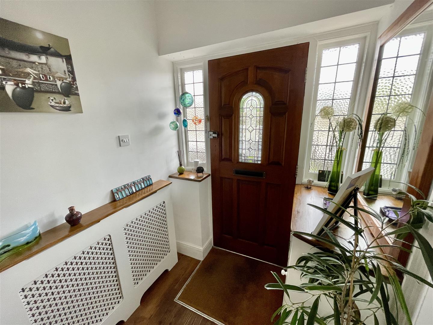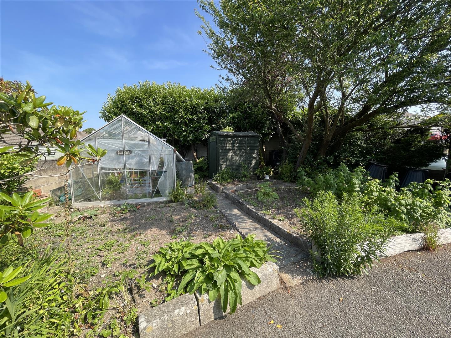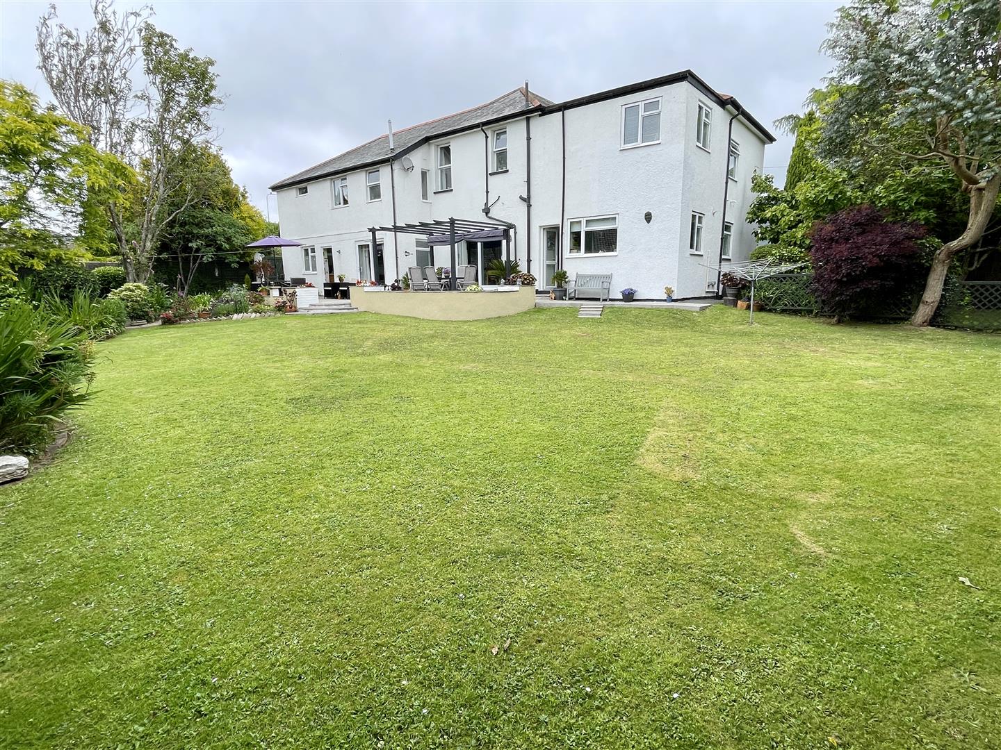 A 27' wide entrance opens into a tarmac parking area with space for five cars, comfortably parked. Kitchen garden, greenhouse and garden shed. To the rear, a delightful mature large back garden with wide sandstone paved patio with pergola and cover. Extensive lawned garden with well stocked borders containing a profusion of interesting specimen bushes, shrubs and herbaceous plants. To the southernly corner, a separate fenced garden with pond, water feature and mature fruit trees including apple.