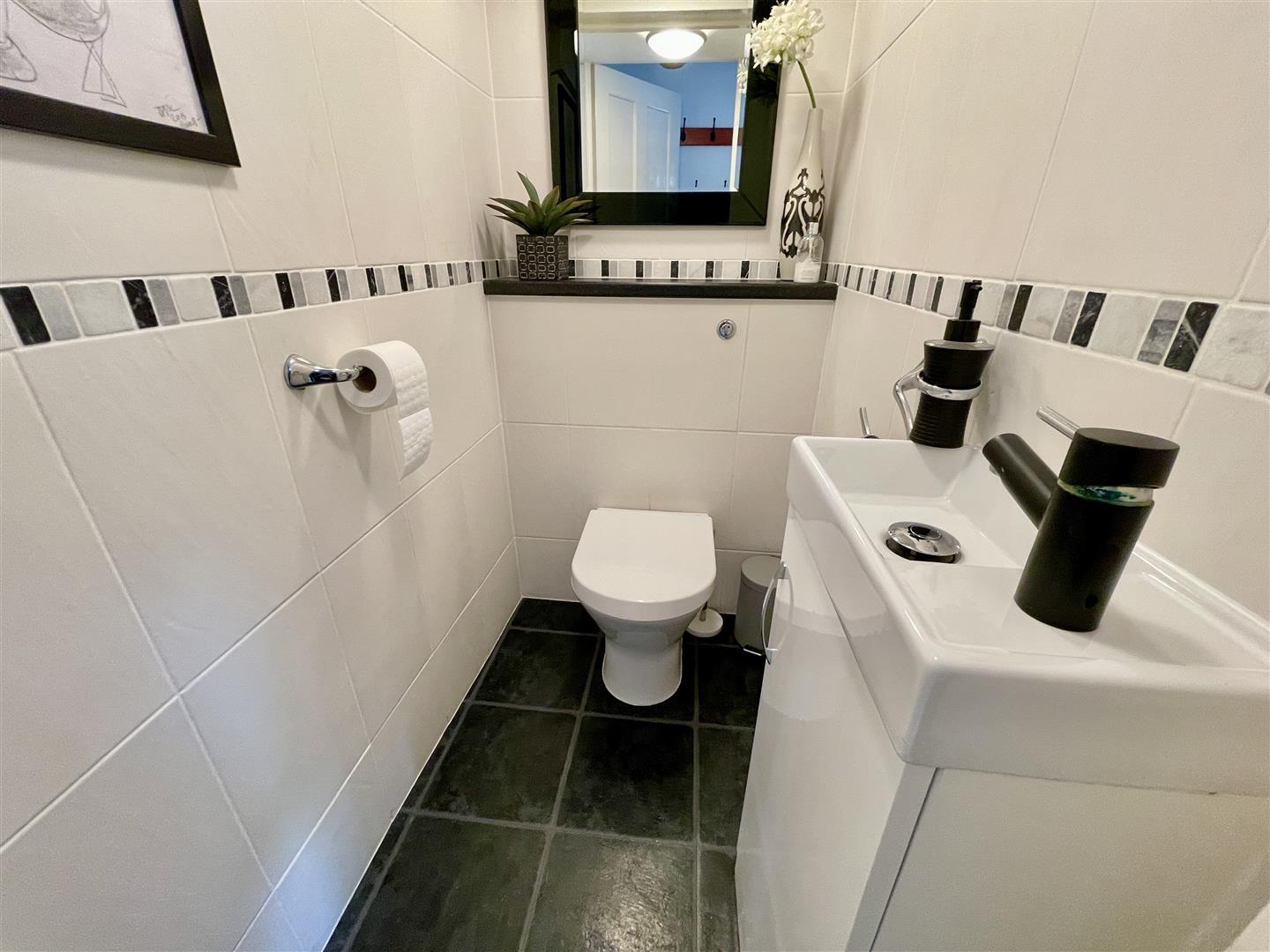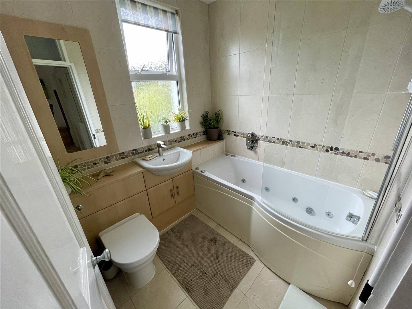 Obscure glazed window to the rear. Quality white suite with close coupled WC, wash hand basin and spa bath with Mira Sport electrically heated shower over.