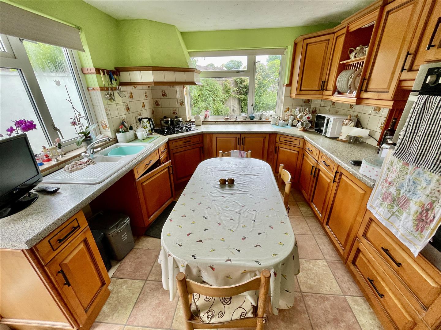 Windows to the side and rear. Double glazed back door. Fitted with a range of cupboard and drawer storage. One and a half bowl composite enamel contemporary sink. Four ring gas hob with extractor hood over. Stoves double oven/grill.